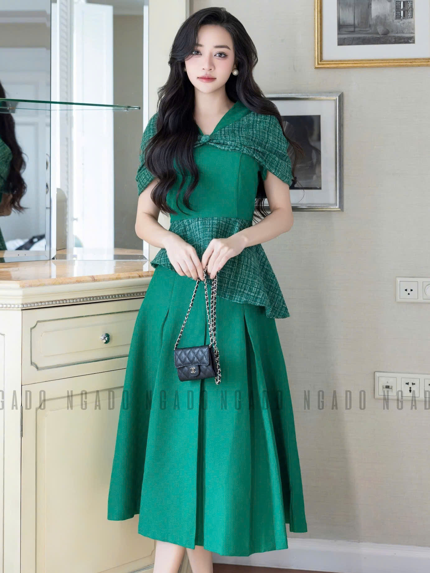 ღ THÔNG TIN SẢN PHẨM: Tên sản phẩm: Đầm xanh lá phối tweed Chất liệu: Thân váy chất xốp santo, vải phối chất dạ Chi tiết sản phẩm: không lót, không túi