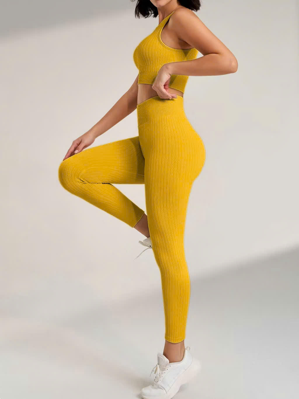 Chất liệu : thun dệt gân dày dặn, co giãn 4 chiều , thoáng khí , thấm mồ hôi tốt Kiểu dáng : quần ngắn cạp cao , áo 2 dây , phần mông có