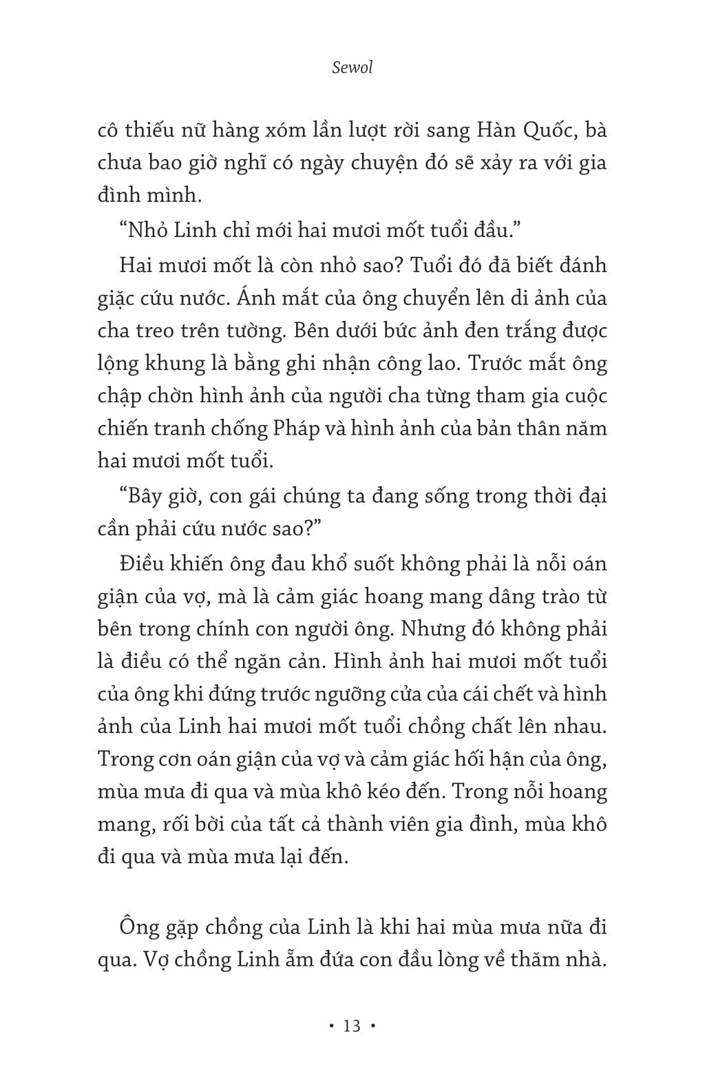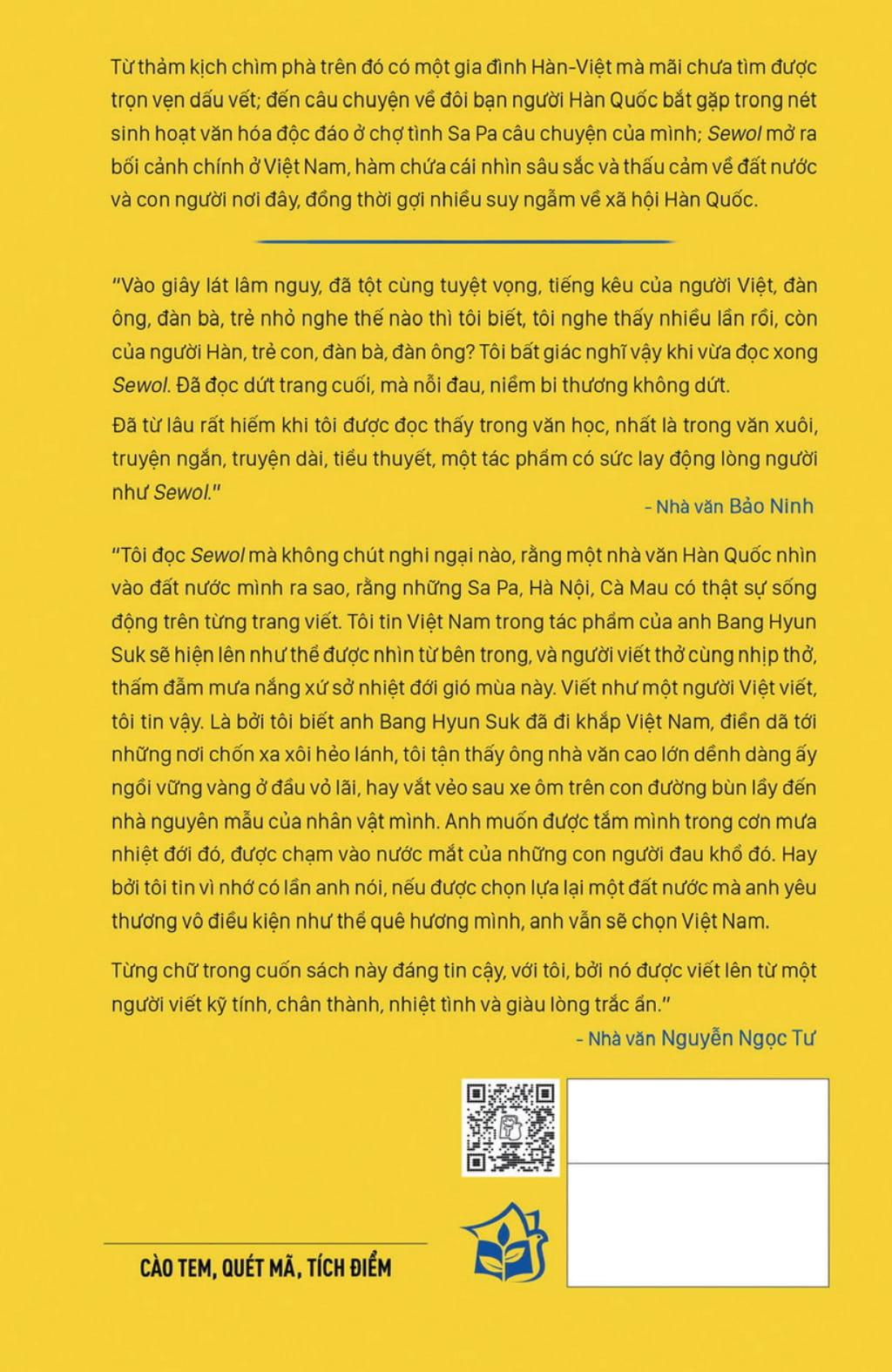 “Tôi đọc Sewol mà không chút nghi ngại nào, rằng một nhà văn Hàn Quốc nhìn vào đất nước mình ra sao, rằng những Sa Pa, Hà Nội, Cà Mau có thật sự sống động trên từng trang viết. Tôi tin Việt Nam trong tác phẩm của anh Bang Hyun Suk sẽ hiện lên như thể được nhìn từ bên trong, và người viết thở cùng nhịp thở, thấm đẫm mưa nắng xứ sở nhiệt đới gió mùa này. Viết như một người Việt viết, tôi tin vậy. Là bởi tôi biết anh Bang Hyun Suk đã đi khắp Việt Nam, điền dã tới những nơi chốn xa xôi hẻo lánh, tôi tận thấy ông nhà văn cao lớn dềnh dàng ấy ngồi vững vàng ở đầu vỏ lãi, hay vắt vẻo sau xe ôm trên con đường bùn lầy đến nhà nguyên mẫu của nhân vật mình. Anh muốn được tắm mình trong cơn mưa nhiệt đới đó, được chạm vào nước mắt của những con người đau khổ đó. Hay bởi tôi tin vì nhớ có lần anh nói, nếu được chọn lựa lại một đất nước mà anh yêu thương vô điều kiện như thể quê hương mình, anh vẫn sẽ chọn Việt Nam. Từng chữ trong cuốn sách này đáng tin cậy, với tôi, bởi nó được viết lên từ một người viết kỹ tính, chân thành, nhiệt tình và giàu lòng trắc ẩn.”