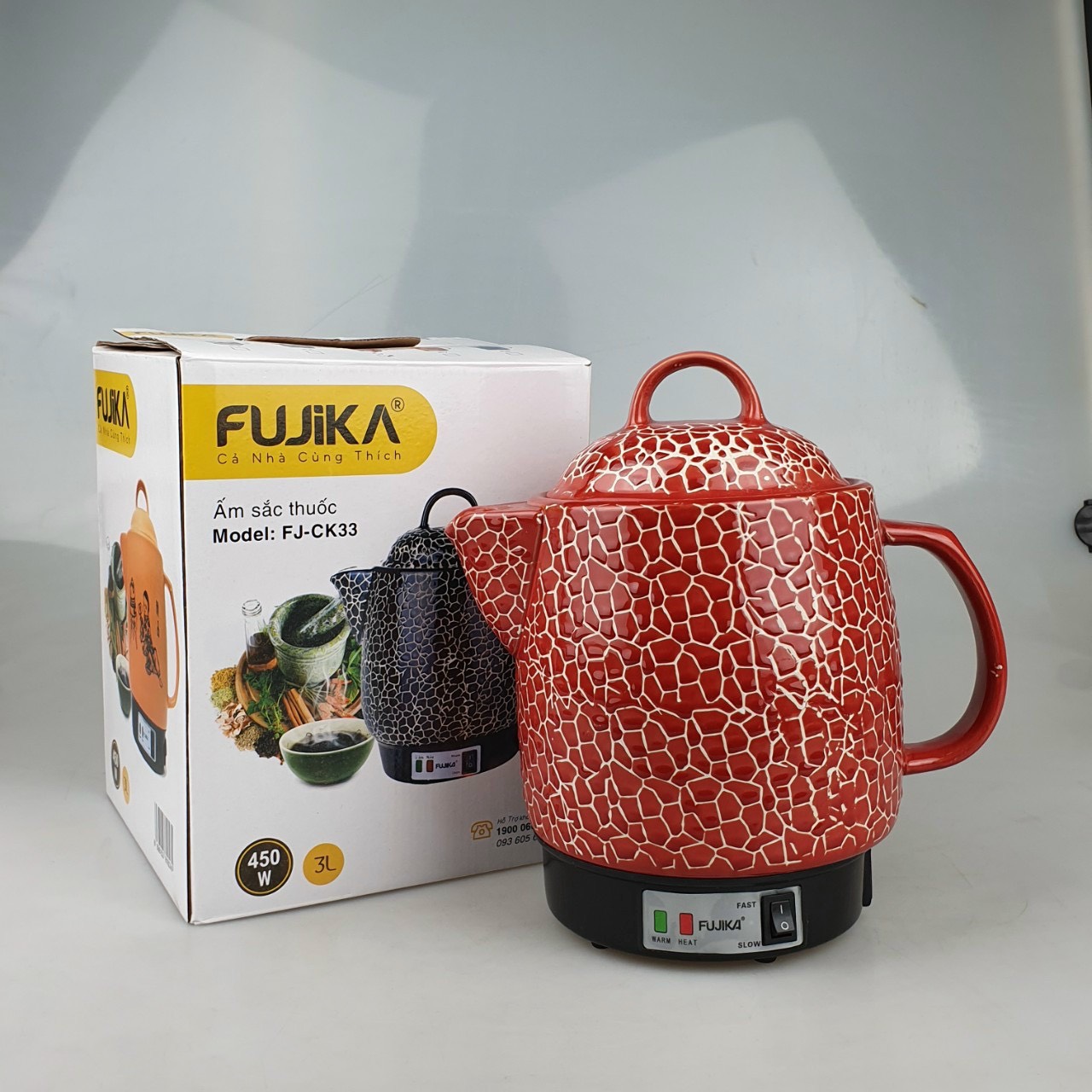 THÔNG SỐ KỸ THUẬT Tên sản phẩm: Siêu thuốc tự động Fujika Mã sản phẩm: FJ-K33 K3 Công suất: 450W Dung tích: 3L Chất liệu siêu thuốc: Gốm sứ Chế độ ngắt tự động: Có
