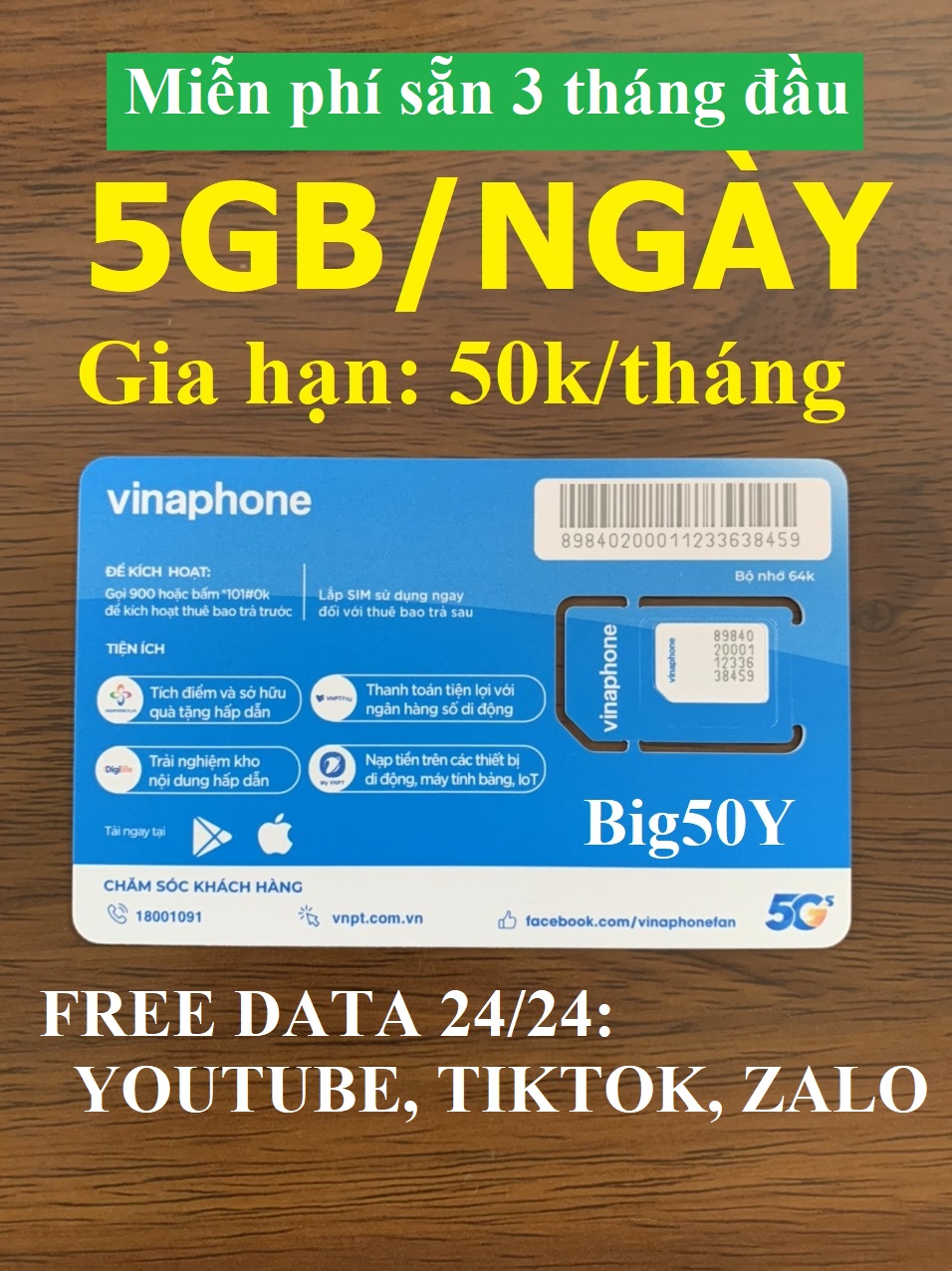 Mua tại TiktokSim MIỄN PHÍ TOÀN BỘ data khi xem Youtube, Tiktok và sử dụng với tốc độ luôn luôn cao. Ngoài ra còn được 5GB/NGÀY (150GB/tháng dùng tất cả các dịch vụ khác), sim dùng toàn quốc và với mức phí cực kỳ hấp dẫn, chỉ 50k/tháng. Thông tin khuyến mãi của sim như sau: