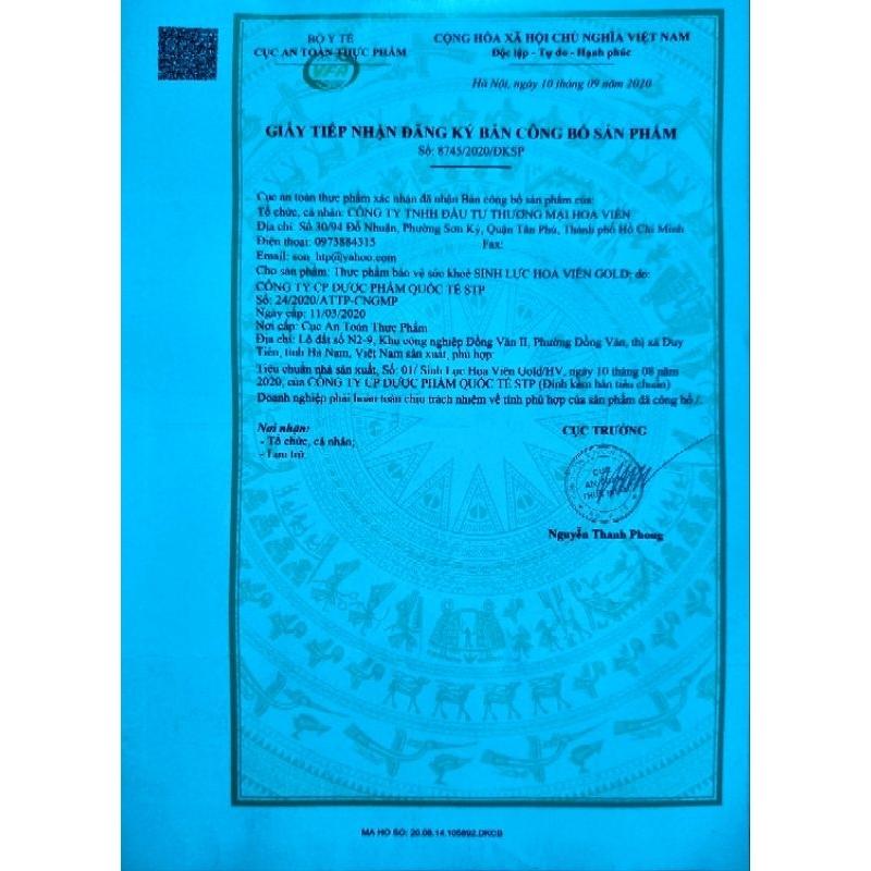 - Thông tin sản phẩm : Quy cách : Hộp 1 lọ x 25 viên Số đăng ký : 8745/2020/ĐKSP Hạn dùng : 3 năm kể từ ngày sản xuất Lưu ý sử dụng Sinh Lực Hoa Viên Gold Sản phẩm Sinh Lực Hoa Viên Gold không phải là thuốc và không có tác dụng thay thế thuốc chữa bệnh. Không sử dụng cho người mẫn cảm với bất kỳ thành phần nào của sản phẩm. Đọc kĩ hướng dẫn sử dụng trước khi dùng.