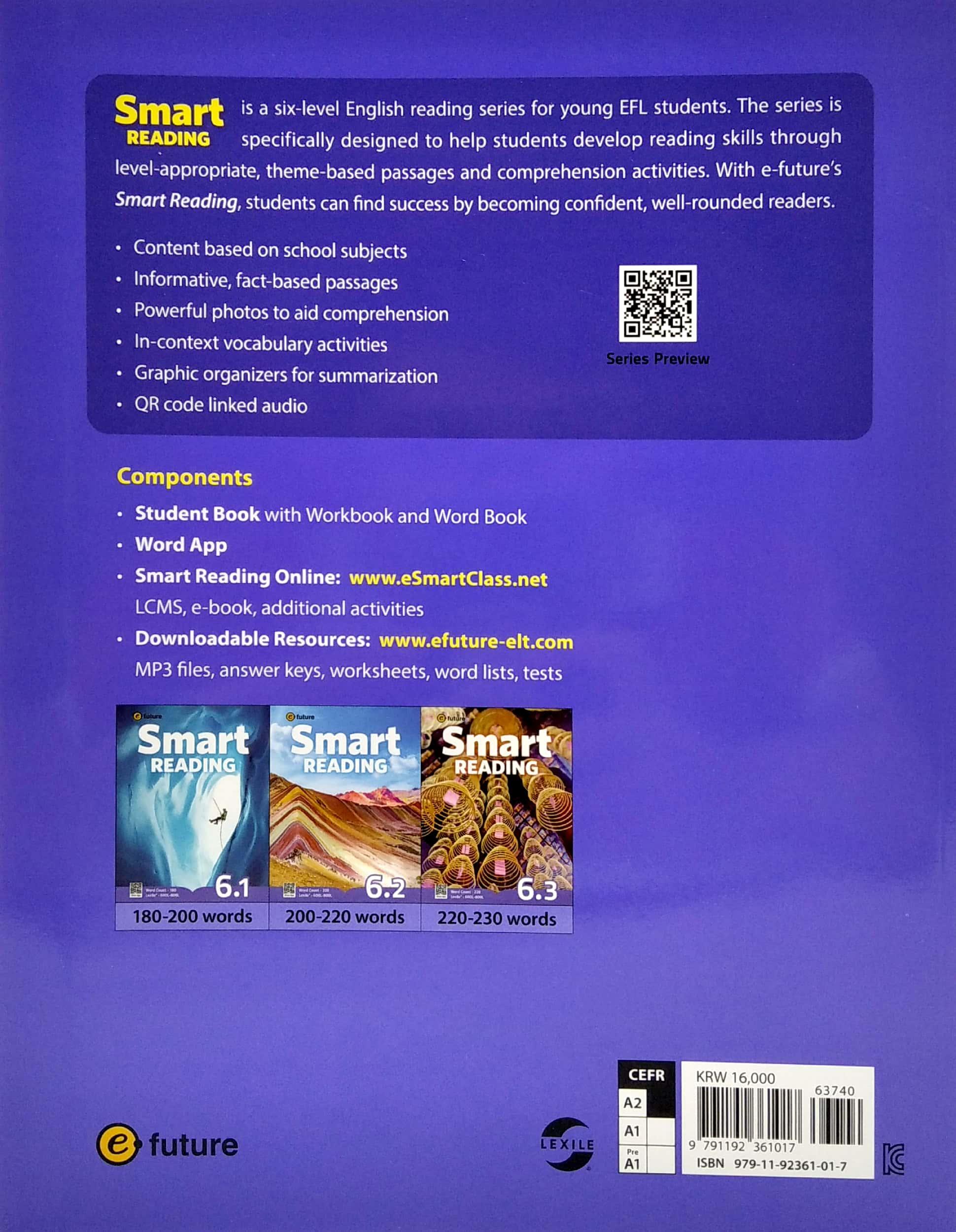 Is a six-level English reading series for young EFL students. The series is specifically designed to help students develop reading skills through level-appropriate, theme-based passages and comprehension activities. With e-future's Smart Reading, students can find success by becoming confident, well-rounded readers.