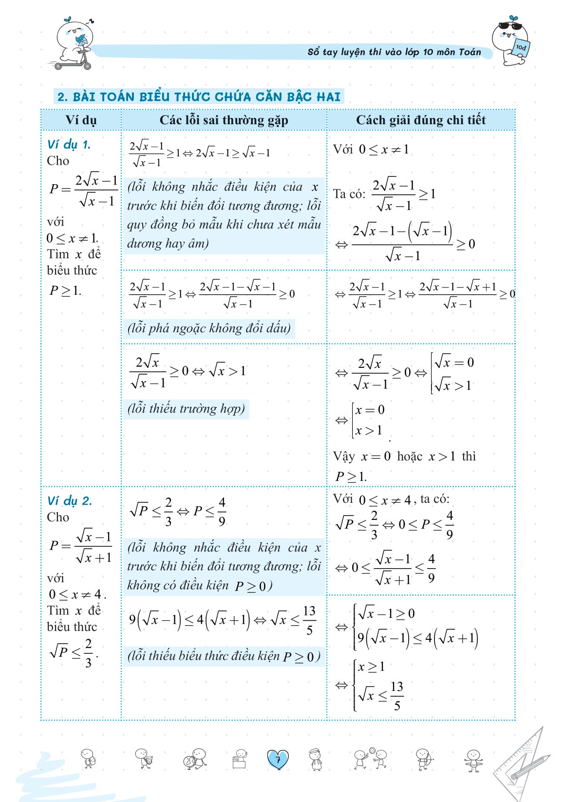 Sổ tay dành riêng một chương để thống kê các lỗi sai thường gặp khi giải toán. Đây là các lỗi sai của học sinh được tổng hợp từ các thầy cô nhiều năm kinh nghiệm trong việc giảng dạy, chấm thi kỳ thi vào 10. Điều này giúp bạn nhận ra những sai lầm thường mắc phải và tránh lặp lại chúng. Chương này cũng cung cấp cách giải đúng cho từng lỗi, giúp bạn hiểu rõ và sửa chữa những sai sót của mình.