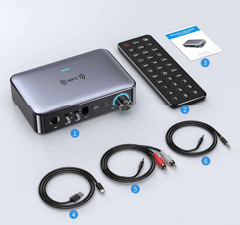 Tính năng: Bộ thu âm thanh tương thích với Bluetooth, bộ chuyển đổi âm thanh kỹ thuật số sang tương tự, bộ điều hợp phát lại đĩa flash USB. Có dây thành không dây, biến