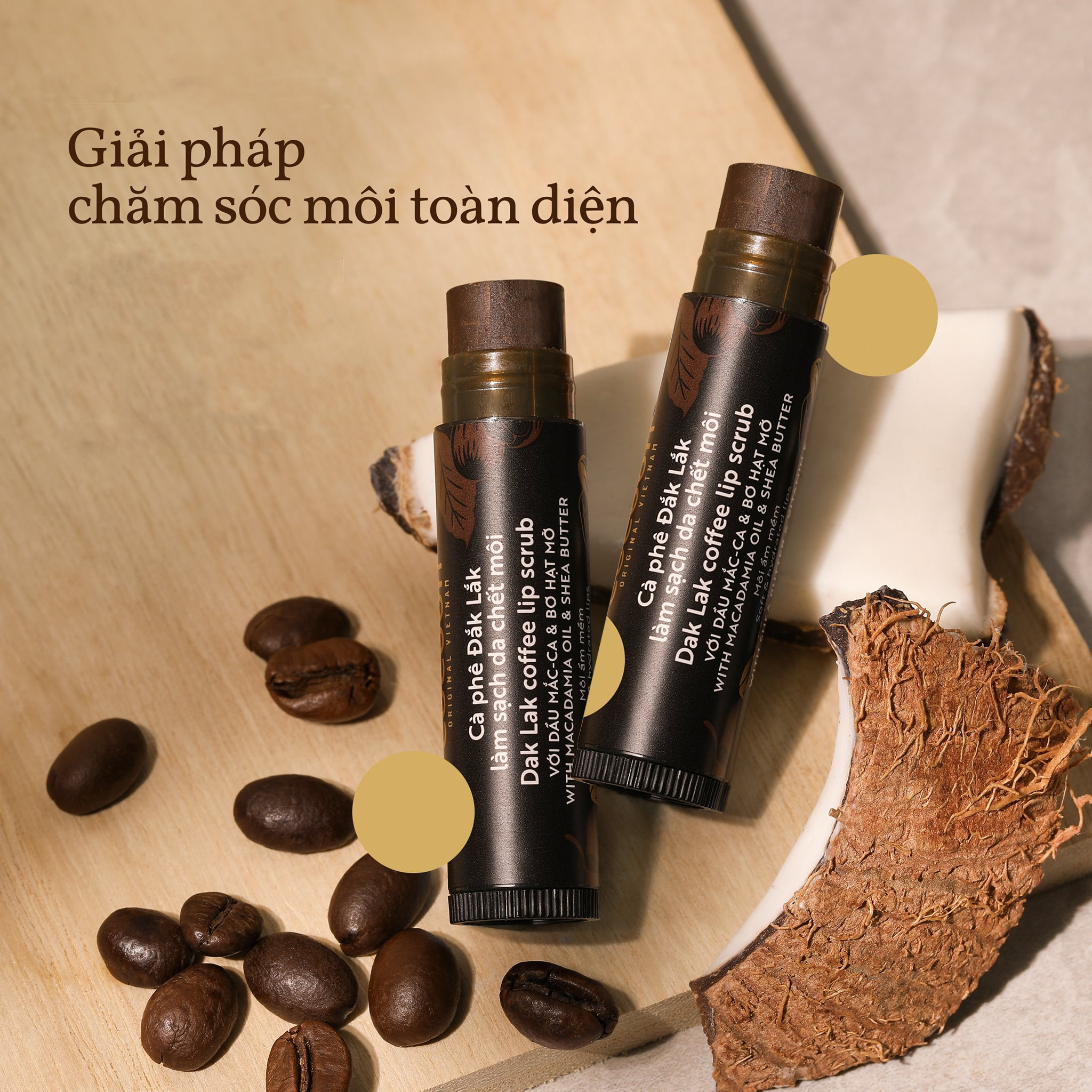 Cà phê đắk lắk làm sạch da chết môi cocoon. những hạt cà phê li ti được rang xay bằng tay hòa quyện vào dầu mắc-ca và bơ hạt mỡ, sẽ nhẹ nhàng làm bong những tế bào da chết ở môi, đem lại làn môi mềm và mịn màng. Công dụng Cà phê đắk lắk làm sạch da chết môi cocoon