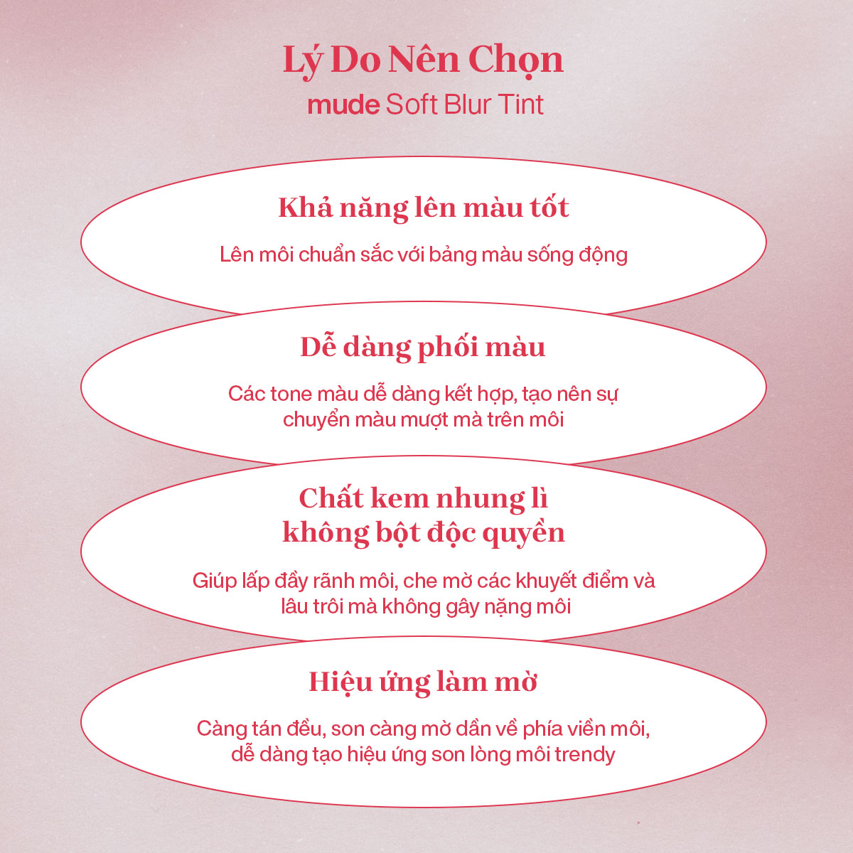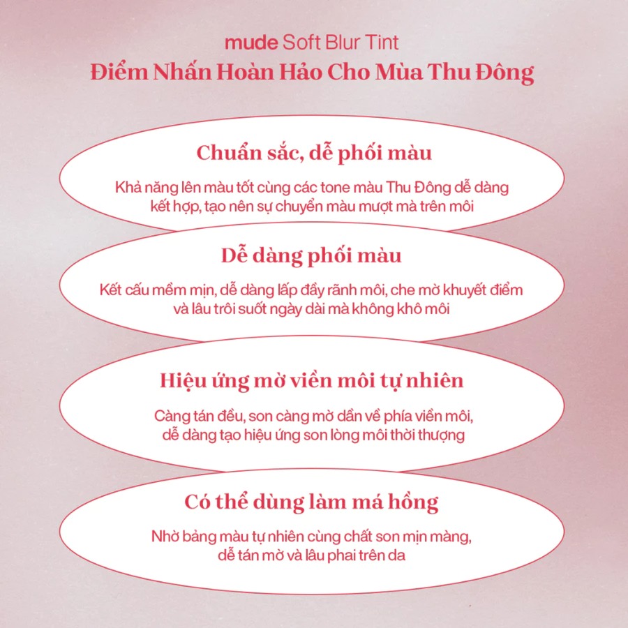 - Càng tán đều, son càng mờ dần về phía viền môi, dễ dàng tạo hiệu ứng son lòng môi trendy