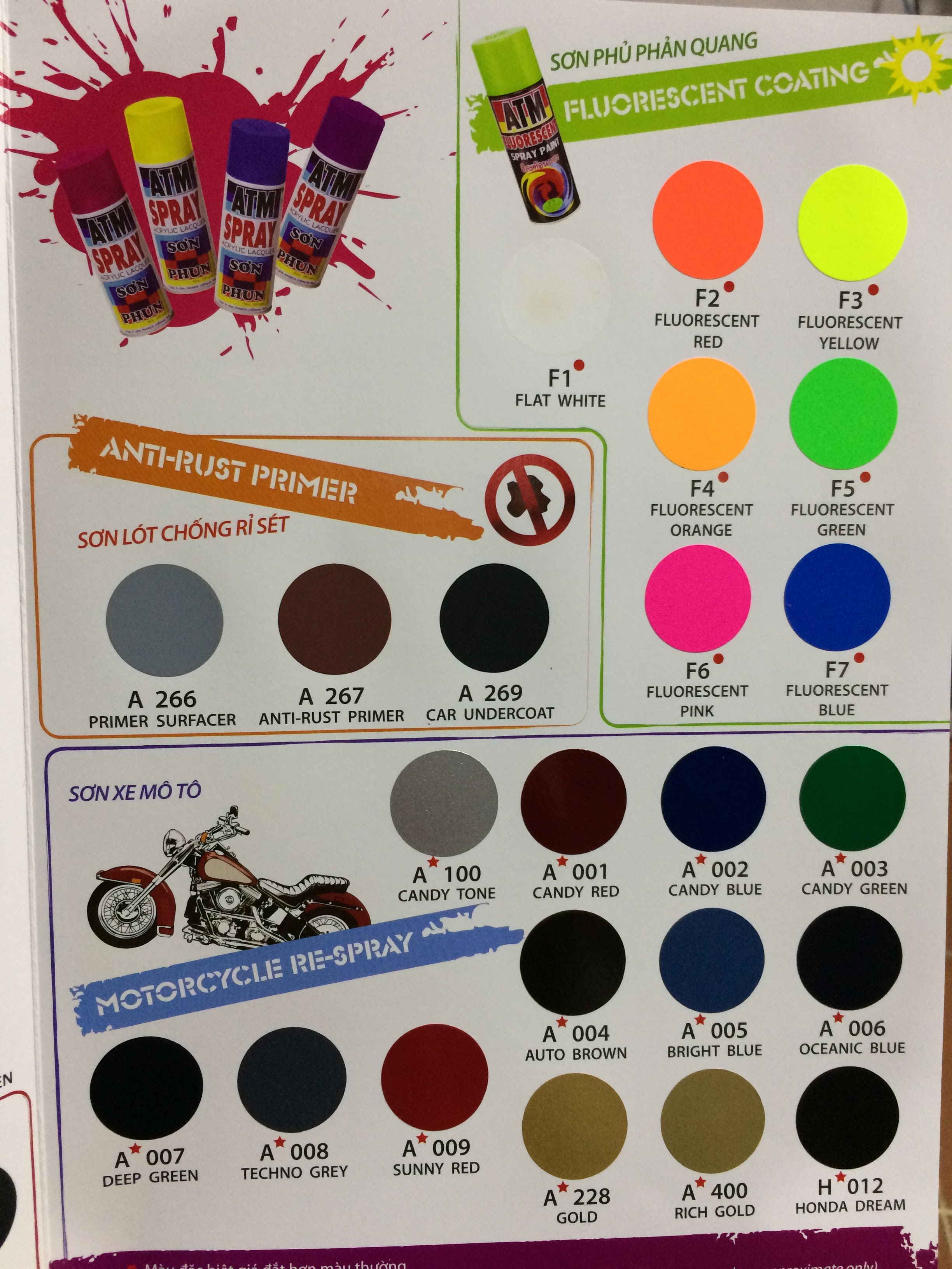 SƠN PHUN “ATM” ACRYLIC: Đặc chế từ hỗn hợp nhựa N/C và ACRYLIC, được đóng gói dưới dạng bình xịt cầm tay rất tiện dụng, dùng sơn để trang trí cho các bề mặt bằng
