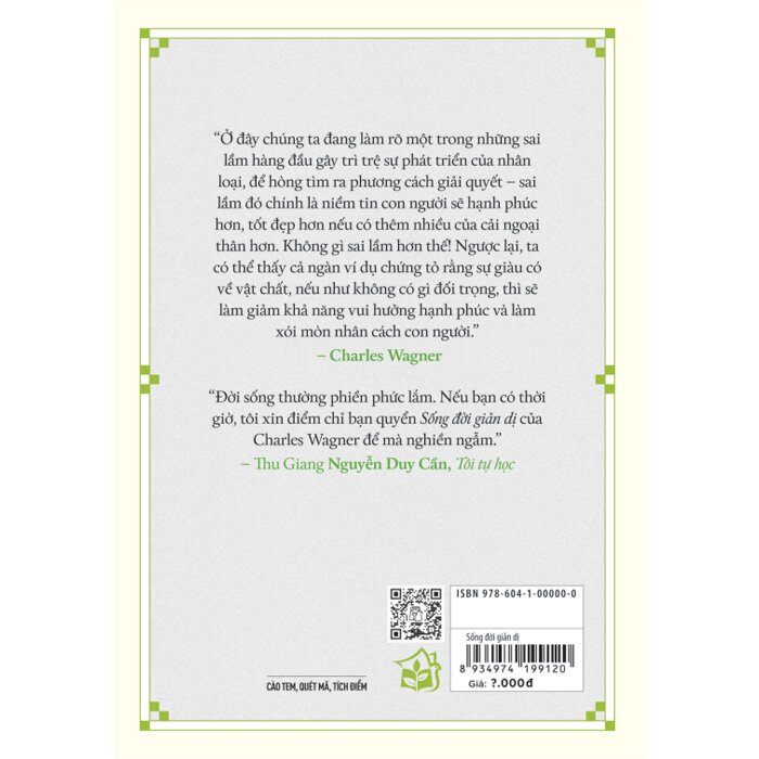 Mua tại TiktokSống Đời Giản Dị Sống đời giản dị chứa đựng những khám phá của Charles Wagner về giá trị của việc sống giản dị giữa sự phức tạp của xã hội hiện đại. Tác giả ủng hộ việc tổ chức một đời sống giản dị, một đời sống với quan niệm biết chọn lựa những gì là chính yếu và biết bỏ qua những gì là phụ thuộc. Ông khuyến khích độc giả xem xét lại các ưu tiên của mình và nhấn mạnh tầm quan trọng của sự hoàn thiện bên trong hơn là sự giàu có bên ngoài. Bằng cách đó, con người sẽ tìm thấy hạnh phúc, bình yên về mặt tinh thần và cuộc sống của con người cũng sẽ trở nên ý nghĩa hơn.