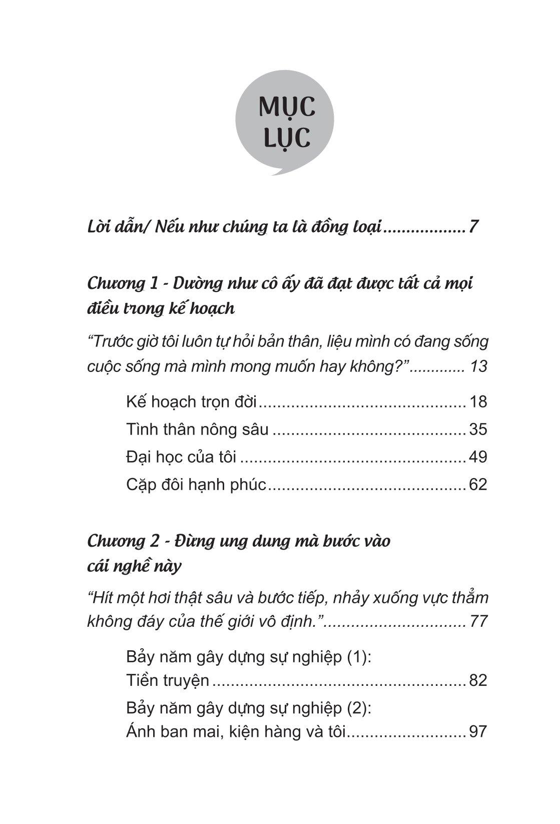 Sống Một Đời Theo Ước Nguyện Bản Thân Cuốn sách gồm có 5 chương chính: Chương 1: Dường như cô ấy đã đạt được tất cả mọi điều trong kế hoạch Chương 2: Đừng ung dung mà bước vào cái nghề...