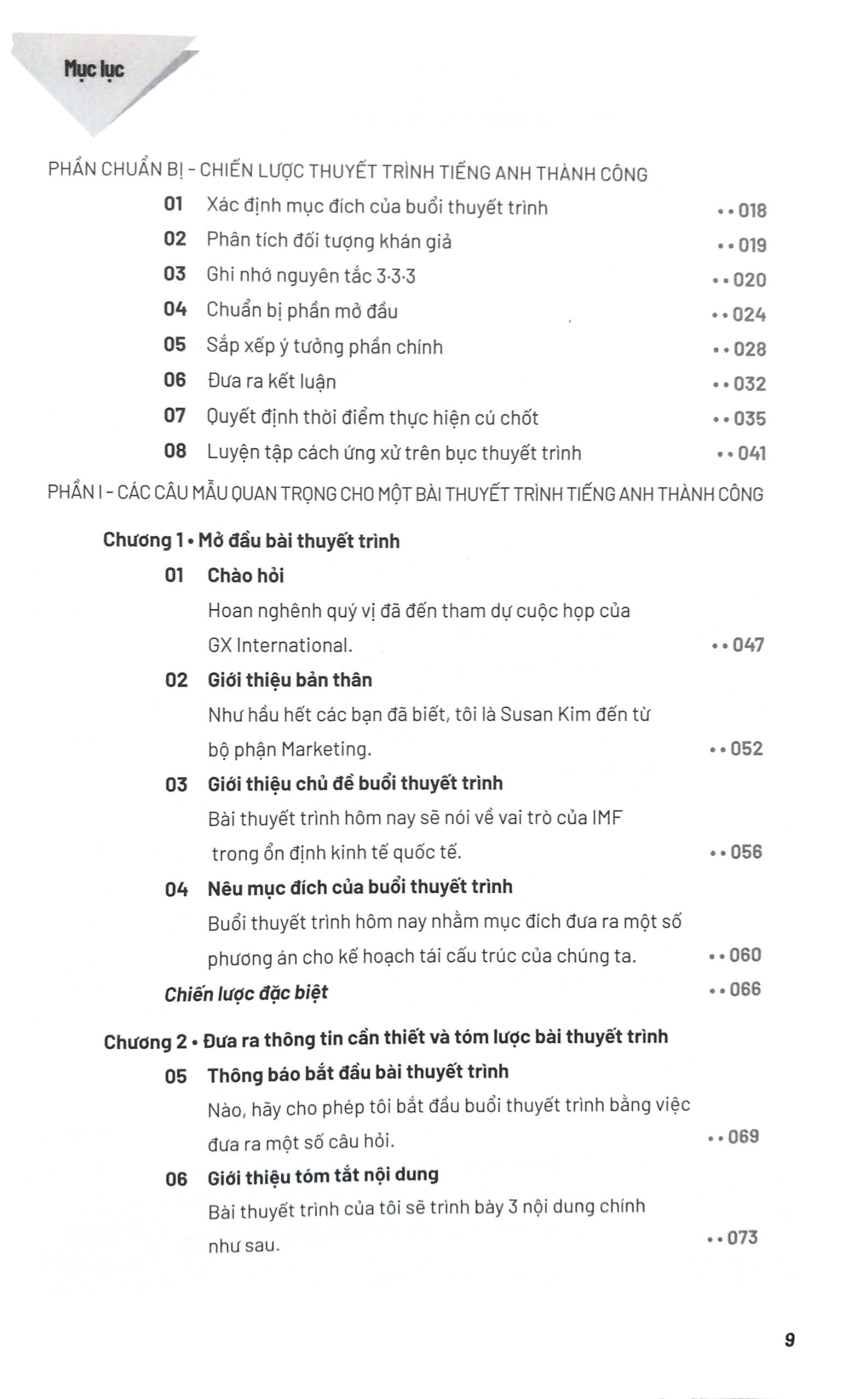 “Đừng chỉ tiếp cận tiếng Anh như một ngôn ngữ mà hãy coi nó là công cụ để giao tiếp trong công việc và trong cuộc sống hằng ngày. Năng lực giao tiếp tiếng Anh lúc này chính là khả năng trình bày nhanh chóng, hiệu quả các nội dung cần truyền đạt bằng những mẫu câu chính xác và ngắn gọn.” Đó chính là tiêu chí mà tác giả đã hướng tới khi xây dựng cuốn sách này. Theo đó, người học sẽ được làm quen với những mẫu câu tiếng Anh hữu dụng theo 5 tình huống giao tiếp thường gặp trong công việc gồm: gọi điện thoại, hội họp, đàm phán, đi công tác và tiếp khách. Ngoài ra, phần II của cuốn sách còn cung cấp 1.700 cấu trúc câu chia theo 35 chủ đề thường gặp như chào hỏi, gặp đối tác, họp bàn, thương thảo, tán gẫu, đi công tác… Nhờ đó, bạn có thể dễ dàng tra cứu và áp dụng ngay những mẫu câu này trong các tình huống thực tế mà mình gặp phải trong quá trình làm việc.