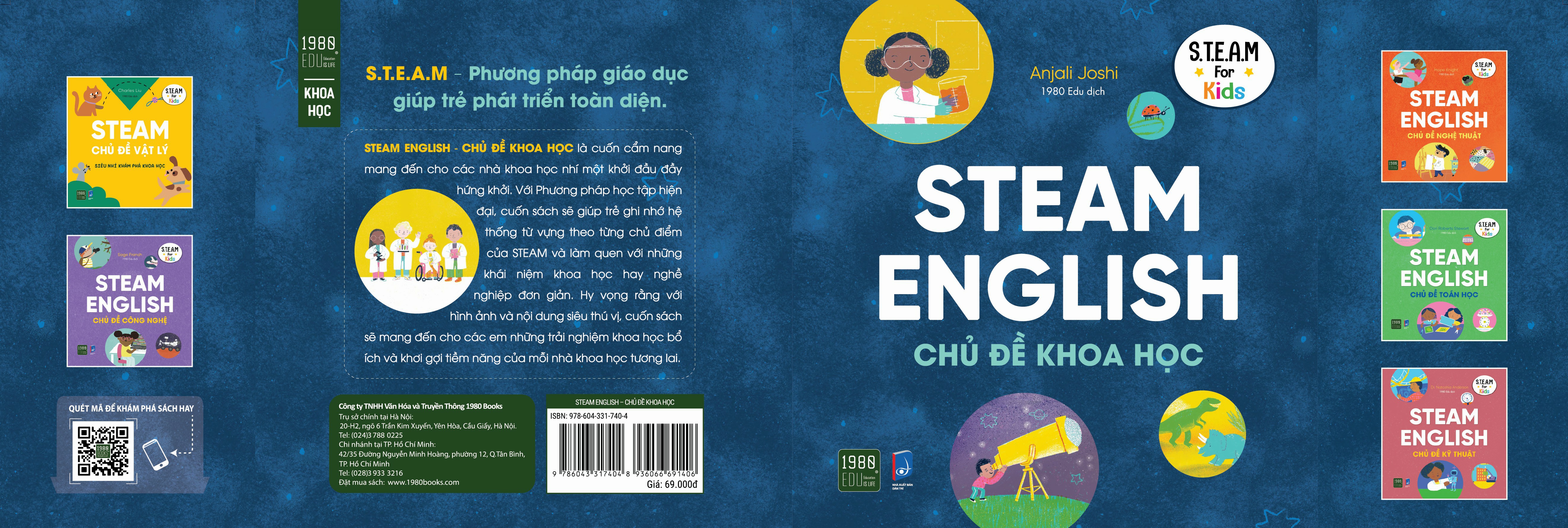 STEAM ENGLISH – CHỦ ĐỀ KHOA HỌC là cuốn cẩm nang mang đến cho các nhà khoa học nhí một khởi đầu đầy hứng khởi. Với phương pháp học hiện đại cuốn sách sẽ giúp trẻ ghi nhớ hệ thống từ vựng theo từng chủ điểm của STEAM và làm quen với những khái niệm khoa học hay nghề nghiệp đơn giản. Hy vọng rằng với hình ảnh và nội dung siêu thú vị, cuốn sách sẽ giúp các em có được những trải nghiệm khoa học ích và khơi gợi tiềm năng của những nhà khoa học tương lai.