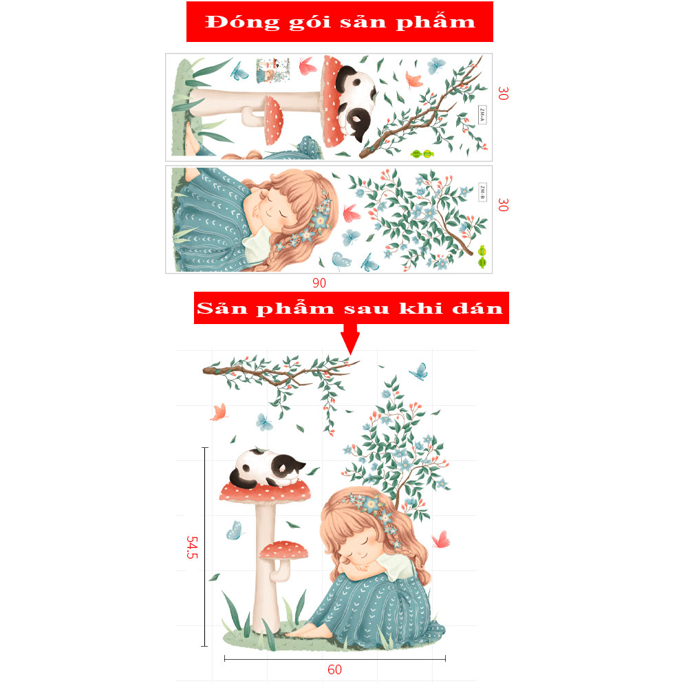 ✨Sticker Giấy Dán Tường Decal Dán tường Tranh Dán Tường Trang Trí Tường Mẫu Cô Bé Bên Cây Nấm ZH-1010