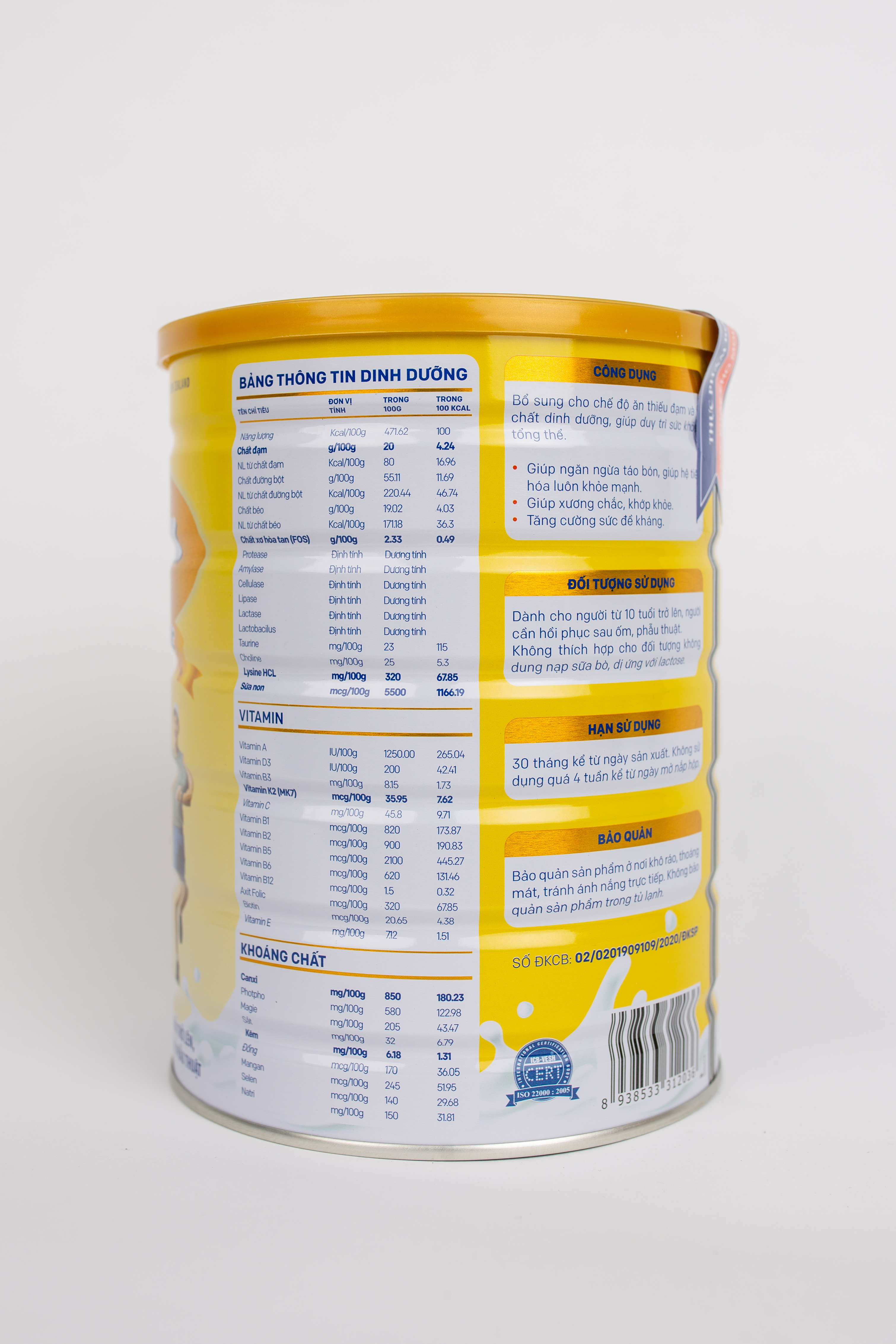 1. Thành phần: Whey protein, Sữa bột, Đạm sữa, Soy Protein, L-Lysine HCL, Taurine, Sữa non, Betaglucan, Vitamin K2MK7 0.2 %, FOS, Maltodextrin, Đường, Vitamin (Vitamin A, Vitamin D, Vitamin E, Vitamin C, Vitamin