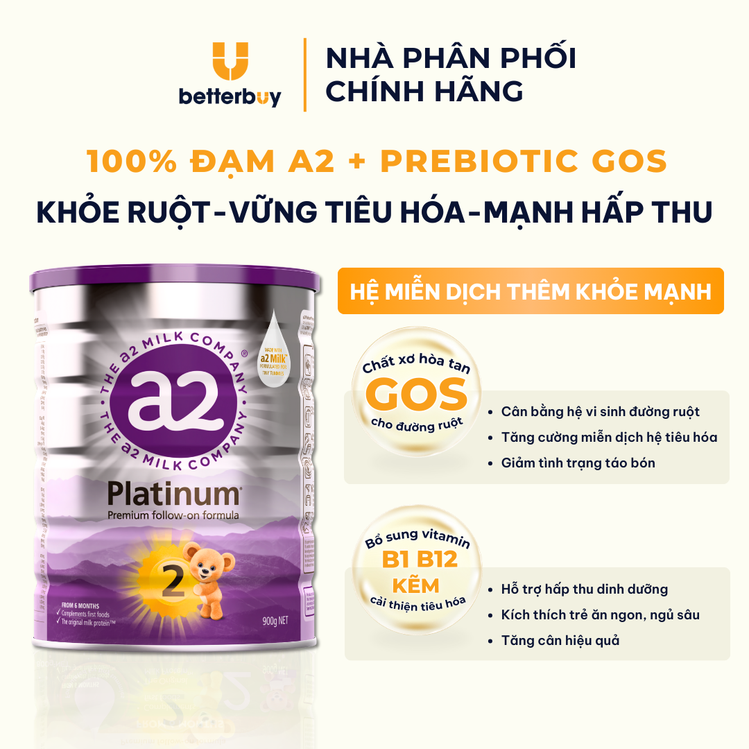 a2 Platinum Premium - Sữa công thức cao cấp nhập khẩu trực tiếp từ New Zealand, 100% đạm A2 chuyên hỗ trợ tiêu hóa và phát triển toàn diện cho trẻ từ 6-12 tháng. Thông tin sản phẩm ◈ Thương hiệu: The a2 Milk Company ◈ Xuất xứ: New Zealand ◈ Đối tượng sử dụng: Trẻ từ 6-12 tháng ◈ Khối lượng: 900g ◈ Hạn sử dụng: 24 tháng kể từ ngày sản xuất (Xem trên bao bì) Lợi ích nổi bật ◈ 100% đạm A2, không lẫn đạm A1: an toàn với hệ tiêu hóa nhạy cảm, giảm nôn trớ, táo bón, khó tiêu ◈ Bổ sung chất xơ GOS: cân bằng hệ vi sinh đường ruột, kích thích trẻ ăn ngon, ngủ ngon ◈ Kẽm, Vitamin B1, B12: Hỗ trợ dinh dưỡng và kích thích ăn ngon cho bé trong giai đoạn ăn dặm. ◈ Bổ sung DHA, EPA: phát triển trí não, thị giác, tăng cường khả năng tư duy - quan sát ◈ Canxi, Phospho và Vitamin D: hệ xương và răng chắc khỏe, hỗ trợ tăng trưởng chiều cao. ◈ 25 vitamin & khoáng chất thiết yếu: tăng cường đề kháng & miễn dịch khỏe mạnh Hướng dẫn sử dụng ◈ Vệ sinh tay và dụng cụ pha thật kỹ, tiệt trùng trước khi dùng. ◈ Đun sôi nước, để nguội khoảng 30 phút (nhiệt độ khoảng 40°C). ◈ Dùng 1 muỗng gạt ngang pha với 50ml nước. ◈ Lắc đều cho đến khi tan hết bột. ◈ Kiểm tra nhiệt độ sữa trước khi cho bé uống. ◈ Dùng ngay sau khi pha. Bỏ phần thừa sau 1 giờ. Hướng dẫn bảo quản ◈ Bảo quản nơi thoáng mát, khô ráo. ◈ Đóng kín nắp sau mỗi lần sử dụng. ◈ Sau khi mở nắp, sử dụng trong vòng 4 tuần. ◈ Không bảo quản trong tủ lạnh. ◈ Dùng dụng cụ khô, sạch để lấy sữa – không làm ướt muỗng. Cam kết ◈ Đại lý phân phối chính thức của The a2 Milk Company - Cam kết sản phẩm chính hãng 100%. ◈ Sản phẩm giá tốt - còn hạn sử dụng xa. Lưu ý ◈ Sữa mẹ là thức ăn tốt cho trẻ sơ sinh và trẻ nhỏ. Chỉ sử dụng sữa công thức khi mẹ thiếu sữa hoặc theo chỉ định chuyên gia y tế ◈ Không dùng cho người dị ứng với sữa bò, cá hoặc đậu nành.