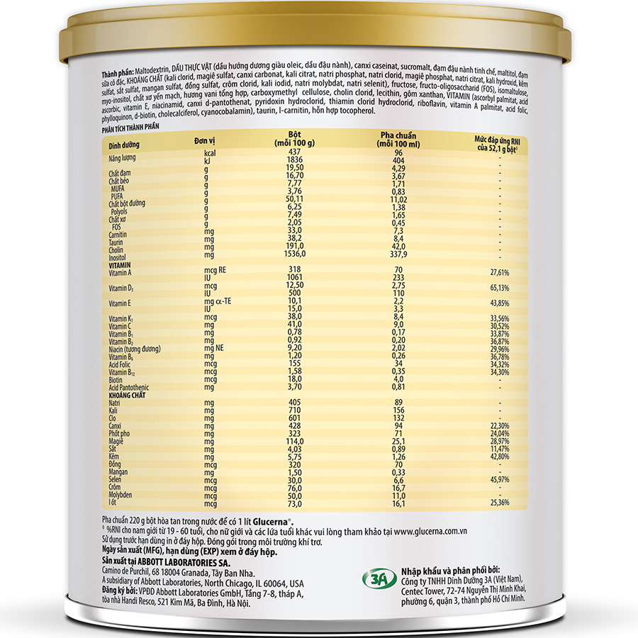 - Phối hợp độc đáo các dưỡng chất bao gồm Fructo-oligosaccharid (FOS) giúp hỗ trợ giảm cân nặng và vòng eo. Cung cấp dinh dưỡng đầy đủ và cân đối cho người đái tháo đường Sữa Bột Abbott Glucerna GLV Dành Cho Người Đái Tháo Đường Và Tiền Đái Tháo Đường đã được chứng minh lâm sàng và cung cấp dinh dưỡng đầy đủ và cân đối cho người đái tháo đường. Sản phẩm giúp bạn tự tin hơn với cơ thể khỏe mạnh lâu dài, hạn chế sự phát triển những triệu chứng của đái tháo đường cho thói quen ăn uống không hợp lý. Có thể thay thế toàn phần bữa ăn chính Sữa Bột Abbott Glucerna GLV Dành Cho Người Đái Tháo Đường Và Tiền Đái Tháo Đường được nghiên cứu và chứng minh thực tế có thể dùng thay thế toàn phần bữa ăn chính hoặc để làm bữa ăn phụ. Sản phẩm giúp bạn gỡ bỏ mối lo lựa chọn thực phẩm, chế độ ăn mỗi ngày, đặc biệt hữu ích khi cần chuẩn bị bữa ăn khi đi xa, du lịch. Hướng dẫn sử dụng