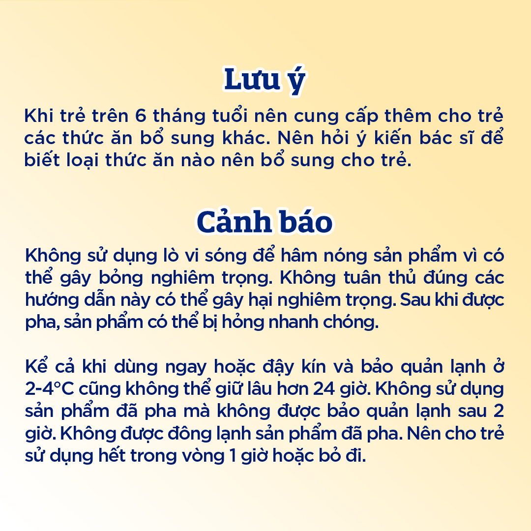 - Không sử dụng lò vi sóng để hâm nóng sản phẩm vì có thể gây bỏng nghiêm trọng. Không tuân thủ đúng các hướng dẫn này có thể gây hại nghiêm trọng. Sau khi được pha, sản phẩm có thể bị hỏng nhanh chóng.