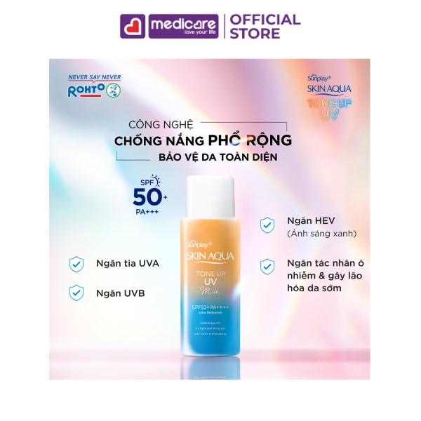 - Đặc biệt, với công thức độc đáo, Sunplay Skin Aqua Tone Up UV Essence sẽ hiệu chỉnh sắc da nhờ sắc tím hóa Lavender giúp che phủ tự nhiên, nâng tông da sáng hồng.