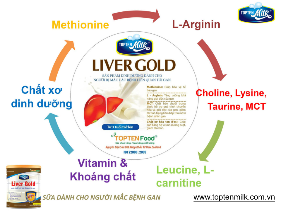 - Methionine: Giúp bảo vệ tế bào gan. L – Arginin: Tăng cường khả năng giải độc của gan. MCT: Chất béo chuỗi trung bình, hỗ trợ quá trình chuyển hóa và giải độc của gan, giảm tải tình trạng kém hấp thu mỡ ở bệnh nhân gan.