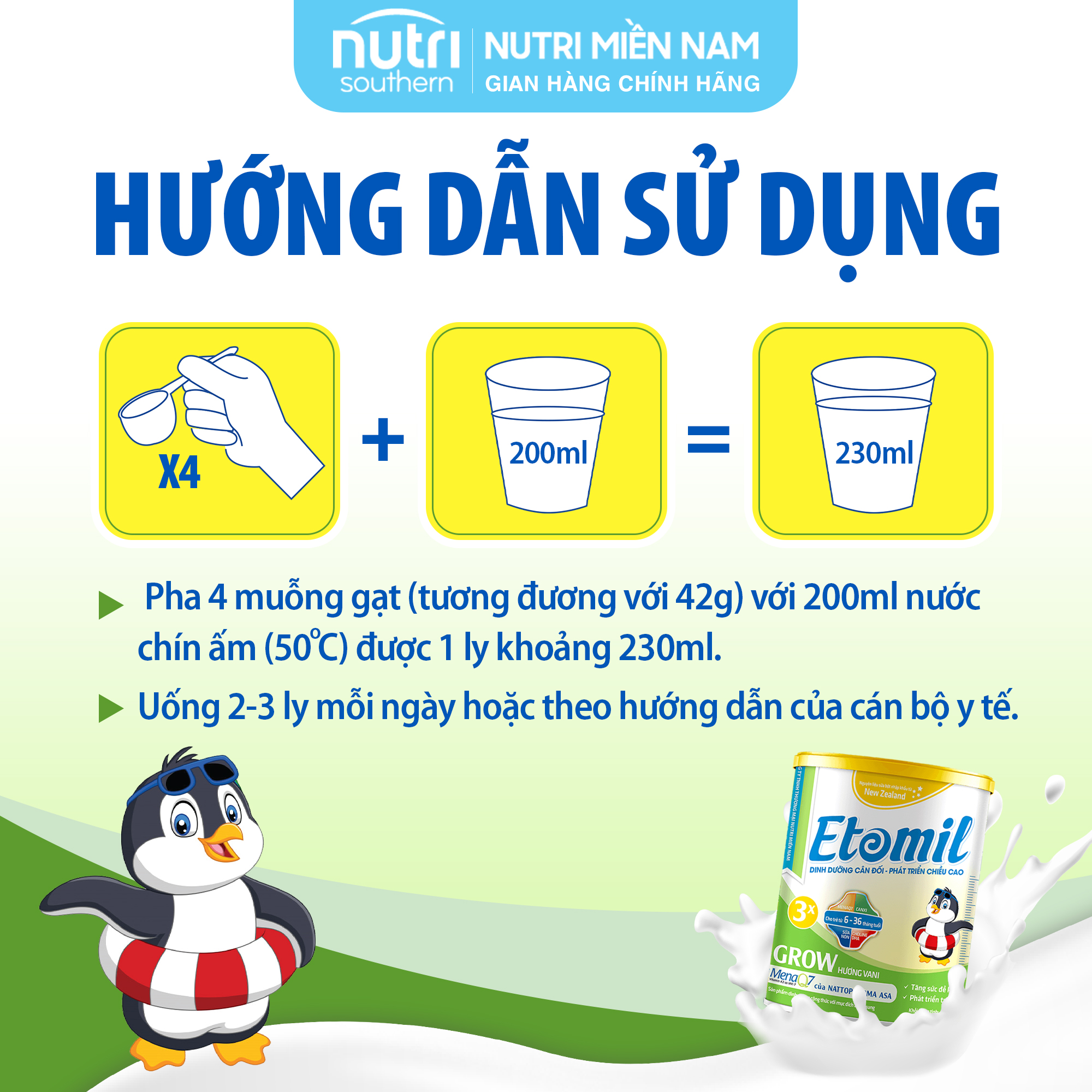 Sữa Tăng Chiều Cao Cho Bé ETOMIL 3X GROW - Giúp Bé Tăng Cường Phát Triển Chiều Cao, Bổ Sung Dinh Dưỡng Cân Bằng THÀNH PHẦN: Năng lượng(Energy) 458Kcal, Protein15g, Chất béo 18g, Axit A –Linolenic (Omega 3) 230mg, Carbohydrate 59g, MenaQ7 MK-7 50mcg, DHA12mg, Choline 30mg, Taurine 7.7mg, Lysine 620mg, Natri 162mg, Kali 588mg, Canxi 761mg, Clorid 337mg, Photpho 463mg, Magie 61.9mg, Sắt 5.2mg, Kẽm 3.1mg, Vitamin A 1320IU, Vitamin D3 237UI, Vitamin E 4.3mg,…   CÔNG DỤNG SẢN PHẨM: ETOMIL 3X GROW là sản phẩm dinh dưỡng dành cho trẻ từ 6-36 tháng tuổi. Dùng cho chế độ ăn hằng ngày, giúp trẻ phát triển thể chất và trí não, đặc biệt là phát triển chiều cao ETOMIL 3X GROW có những công dụng nổi trội: -PHÁT TRIỂN HỆ XƯƠNG: Bổ sung canxi giúp phát triển hệ xương, Vitamin D3 kích thích hấp thu Canxi và Photpho, giúp xương phát triển, rắn chắc. Đặc biệt bổ sung MenaQ7 (MK-7) giúp tăng quá trình Carboxyl hóa (kích hoạt) Osteocalcin – chất có khả năng vận chuyển Canxi tạo xương. -TĂNG SỨC ĐỀ KHÁNG: Kẽm có vai trò điều hòa chức năng hơn 200 Enzyme trong cơ thể, giúp cơ thể loại bỏ các chất độc. Selen giúp chống oxy hóa, kháng độc. Vitamin A giúp tăng khả năng miễn dịch, giúp các tế bào bị tổn thương. Vitamin C giúp kích thích hoạt động miễn dịch. -PHÁT TRIỂN TRÍ NÃO: Bổ sung DHA cần thiết cho sự phát triển não bộ, hoàn thiện hệ thần kinh. Choline tham gia tổng hợp chất truyền xung động thần kinh và tăng cường trí nhớ.   ĐỐI TƯỢNG SỬ DỤNG: Trẻ từ 6 – 36 tháng tuổi.   HUỚNG DẪN SỬ DỤNG: Pha 4 muỗng gạt (tương đương với 42g) với 200ml nước chín ấm (50oC) được 1 ly khoảng 230ml. Uống 2-3 ly mỗi ngày hoặc theo hướng dẫn của cán bộ y tế. Chú ý: Sản phẩm sau khi pha nên cho bé ăn ngay và dùng hết trong vòng 1 giờ. Không cho bé ăn lại phần thừa của bữa trước.   BẢO QUẢN: -Bảo quản nơi khô ráo, sạch sẽ, thoáng mát, tránh ánh nắng trực tiếp. Lon sữa đã mở phải được đóng kín và sử dụng hết trong vòng 3 tuần.
