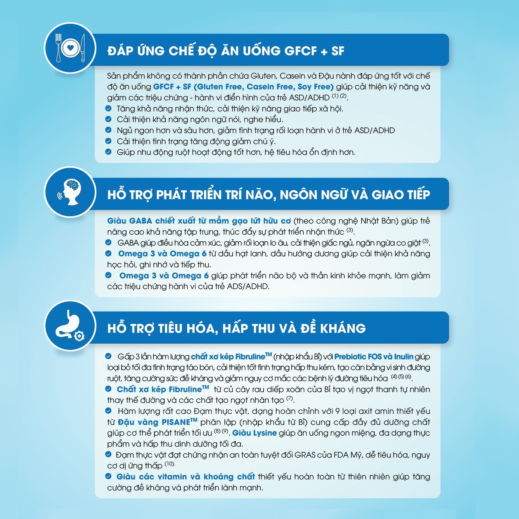 Thay thế bữa ăn phụ hoặc bổ sung cho chế độ ăn hàng ngày thiếu vi chất dinh dưỡng Giúp phát triển trí não và thị giác Giúp phát triển chiều cao Tăng cường sức
