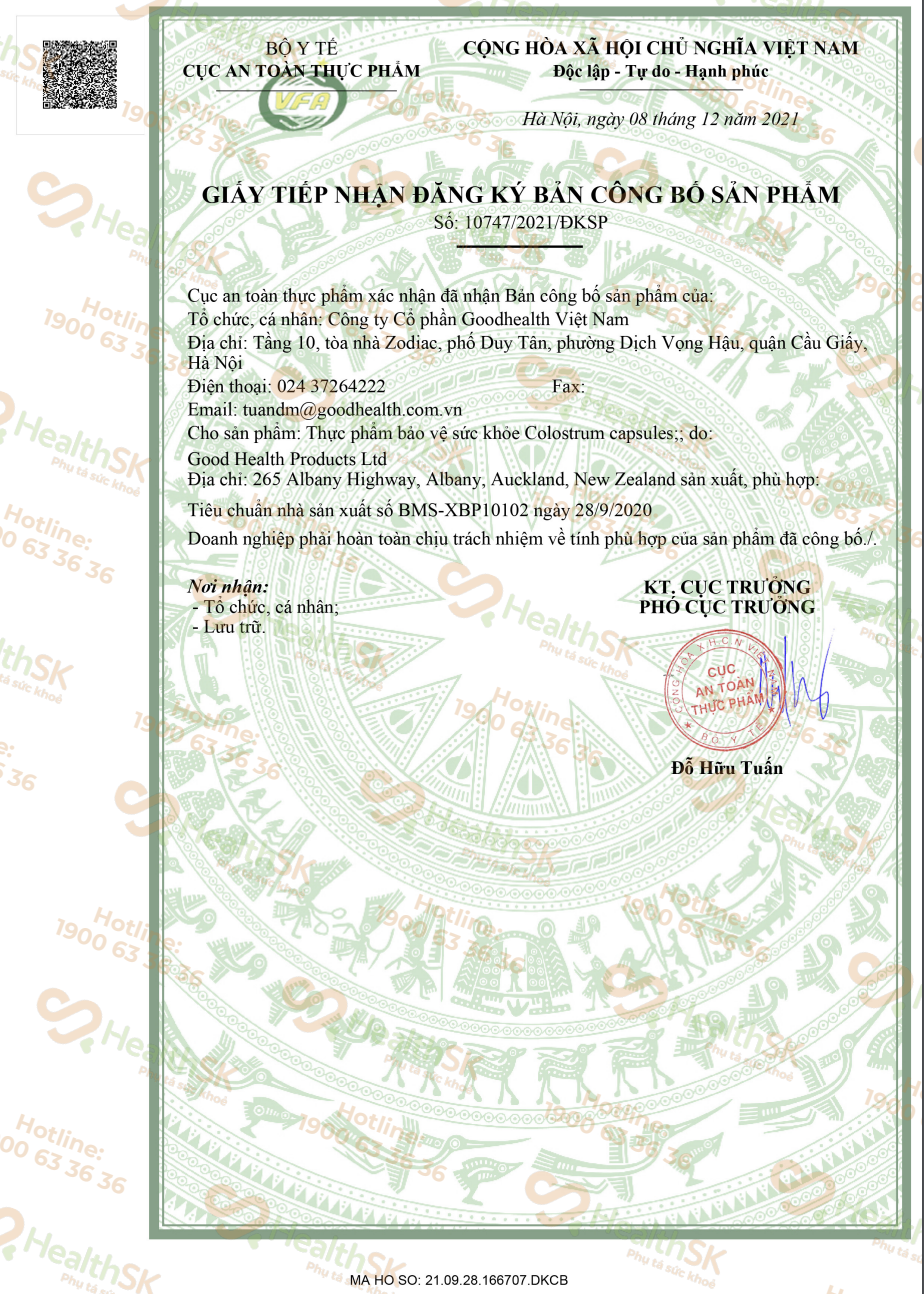 - Dạng viên uống tiện lợi, phù hợp cho người lớn, người có lối sống bận rộn Thực phẩm bảo vệ sức khỏe Goodhealth Colostrum Capsules là sản phẩm chất lượng cao đến từ New Zealand. Được chiết xuất từ những giọt sữa non thuần khiết của bò mẹ trong vòng 24h đầu sau sinh. Goodhealth Colostrum Capsules chứa hàm lượng cao kháng thể (IgG, IgA, IgM) được chứng nhận giúp hỗ trợ củng cố hệ miễn dịch toàn diện, tăng sức đề kháng, hỗ trợ giảm tần suất mắc bệnh, nhanh hồi phục sau ốm và duy trì nền tảng miễn dịch khỏe mạnh từ bên trong. CÔNG DỤNG Cung cấp kháng thể IgG, hỗ trợ nâng cao sức đề kháng cho cơ thể, hỗ trợ tăng cường sức khỏe. THÀNH PHẦN Thành phần trong 1 viên TP BVSK Goodhealth Colostrum Capsules (Sữa non viên) Bột sữa non bò 437,5mg (cung cấp 80,9-105mg IgG) Phụ liệu keo silica khan, magnesi stearat, hương liệu tự nhiên, gelatin LƯU Ý