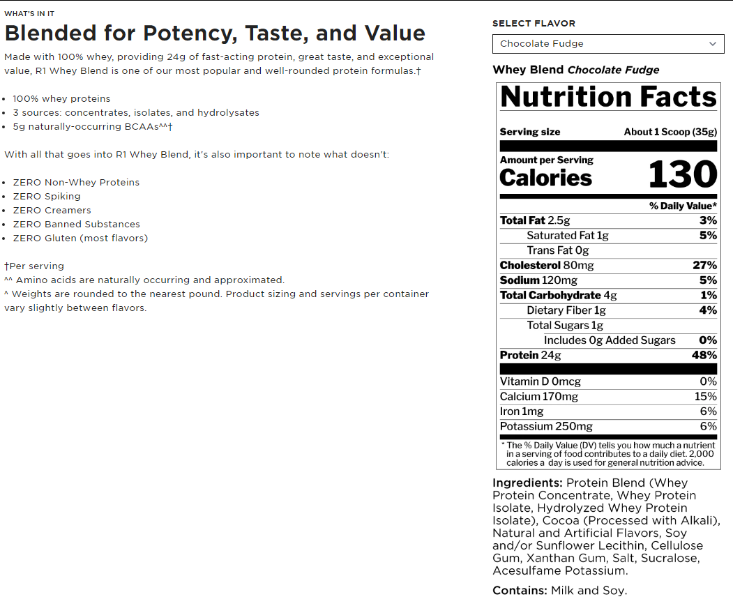 - HOW MUCH R1 WHEY BLEND SHOULD I TAKE? Nó thực sự phụ thuộc vào các yếu tố như cân nặng, chế độ ăn uống của bạn bao gồm những gì, tổng số calo bạn tiêu thụ và mức độ hoạt động của bạn. Một nguyên tắc chung trong thế giới thể hình là nhắm tới 1 gram protein cho mỗi pound trọng lượng cơ thể/mỗi ngày. Nói cách khác, một vận động viên 200 lb nên nhắm mục tiêu 200 g tổng protein từ tất cả các nguồn thực phẩm bao gồm bột protein và các chất bổ sung khác.