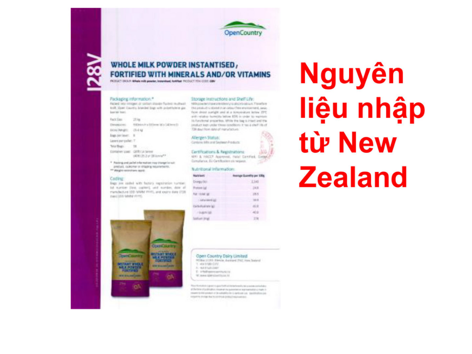 - Nguyên liệu thực phẩm: Sữa bột nguyên kem - Grand meadow - Instant whole milk power 28% - Milk fat 70% (Nguyên liệu nhập khẩu New Zealand), Bột kem béo (Nguyên liệu nhập khẩu