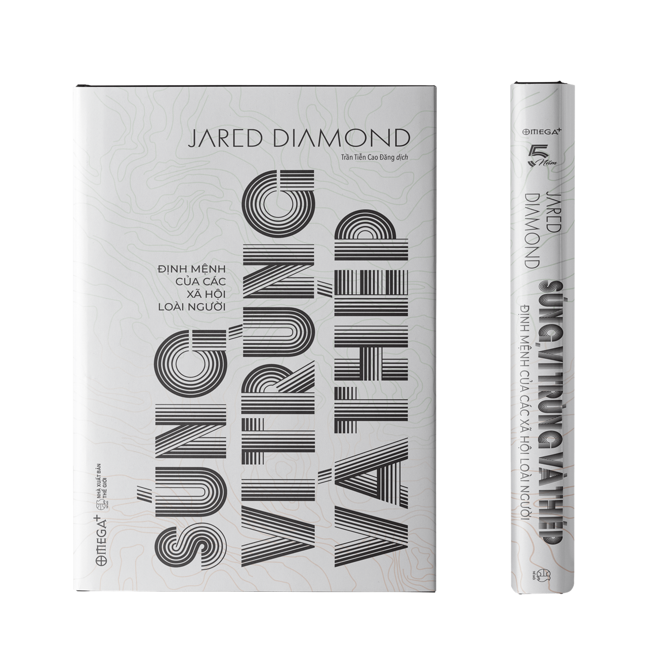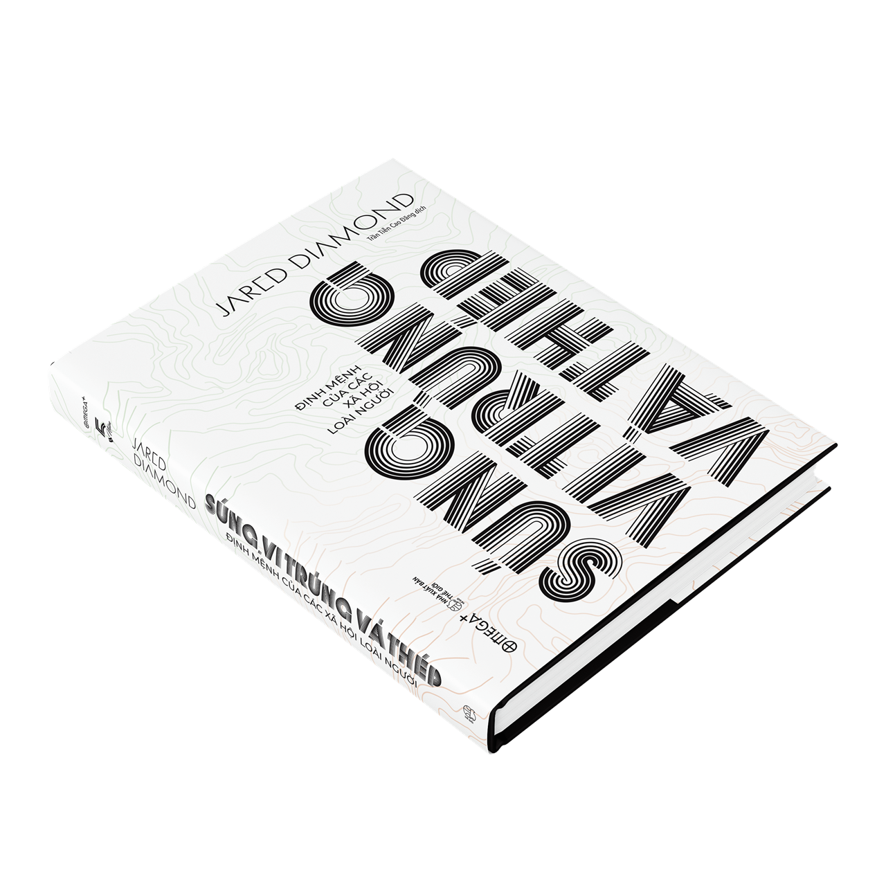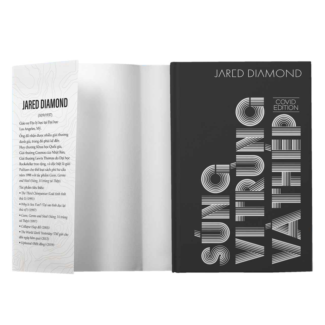 Gáy tròn, bìa cứng bọc vải, nền đen ép nhũ kim chữ “Súng, vi trùng và thép”, dập chìm tinh tế, sang trọng, có in dấu ấn phiên bản Covid Edition, bìa sau in logo bản đặc biệt Omega+.