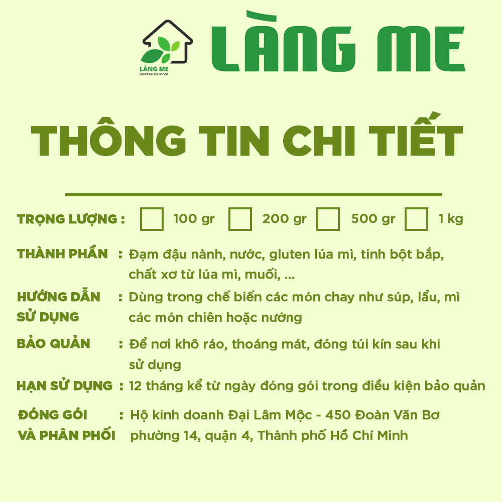 + Thực phẩm chay Làng Me làm từ 100% đậu nành, nước, lúa mì, tinh bột bắp,..