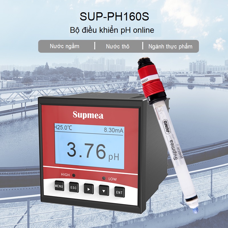 Ứng dụng/tác dụng/lợi ích  Bạn muốn mua một bộ hiển thị độ pH/ORP có độ chính xác cao, bù nhiệt độ, xuất tín hiệu ra 4-20mA và có đủ rơ le điều khiển 2 ngưỡng cao thấp để trung hòa pH. Bạn cũng muốn hiển thị giá trị pH/ nhiệt độ trên máy tính và có thể xuất ra file excel lưu lại dữ liệu lịch sử mà không muốn lắp một hệ PLC lập trình rắc rối? Bộ điều khiển và hiển thị pH/ORP SUP-PH6.0 của Supmea là mặt hàng chất lượng hàng đầu của Trung Quốc xuất khẩu sang Châu Âu đáp ứng mọi yêu cầu của bạn.    Giới thiệu chung Bộ hiển thị và điều khiển pH/ORP SUP-PH6.0 là một thiết bị đo pH/ORP online lắp trên mặt tủ điện, xuất đầy đủ các tín hiệu 4-20mA, rơ le và RS485 hỗ trợ giám sát giá trị đo pH liên tục và chính xác, đồng thời tự động điều khiển hệ thống trung hòa pH, giảm thiểu chi phí nhân công.  Tính năng