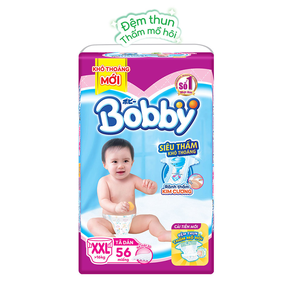 - size XXL: > 16 kg. Gói: 32 miếng - 56 miếng Thông tin thương hiệu Bobby – Thương hiệu tã trẻ em chất lượng đến từ Nhật Bản tự hào là thành viên thuộc tập đoàn Unicharm – Nhà sản xuất tã em bé số 1 được tin dùng bởi các bà mẹ Nhật Bản. Trong hơn 17 năm qua tại thị trường Việt Nam, Bobby được lựa chọn đồng hành cùng hàng triệu em bé từ những ngày đầu tiên chào đời. Bobby cung cấp cho mẹ Việt các sản phẩm tiện lợi từ miếng lót sơ sinh, tã dán sơ sinh, khăn giấy ướt, tã quầ Sử dụng thế mạnh là thành viên của tập đoàn hàng đầu thế giới, các sản phẩm mang thương hiệu Bobby đều được áp dụng dây chuyền sản xuất độc quyền đến từ Unicharm Nhật Bản. Bobby trong lòng người dùng Việt chính là thương hiệu uy tín và thấu hiểu, đồng hành cùng con nhỏ ngay từ lúc chào đời.