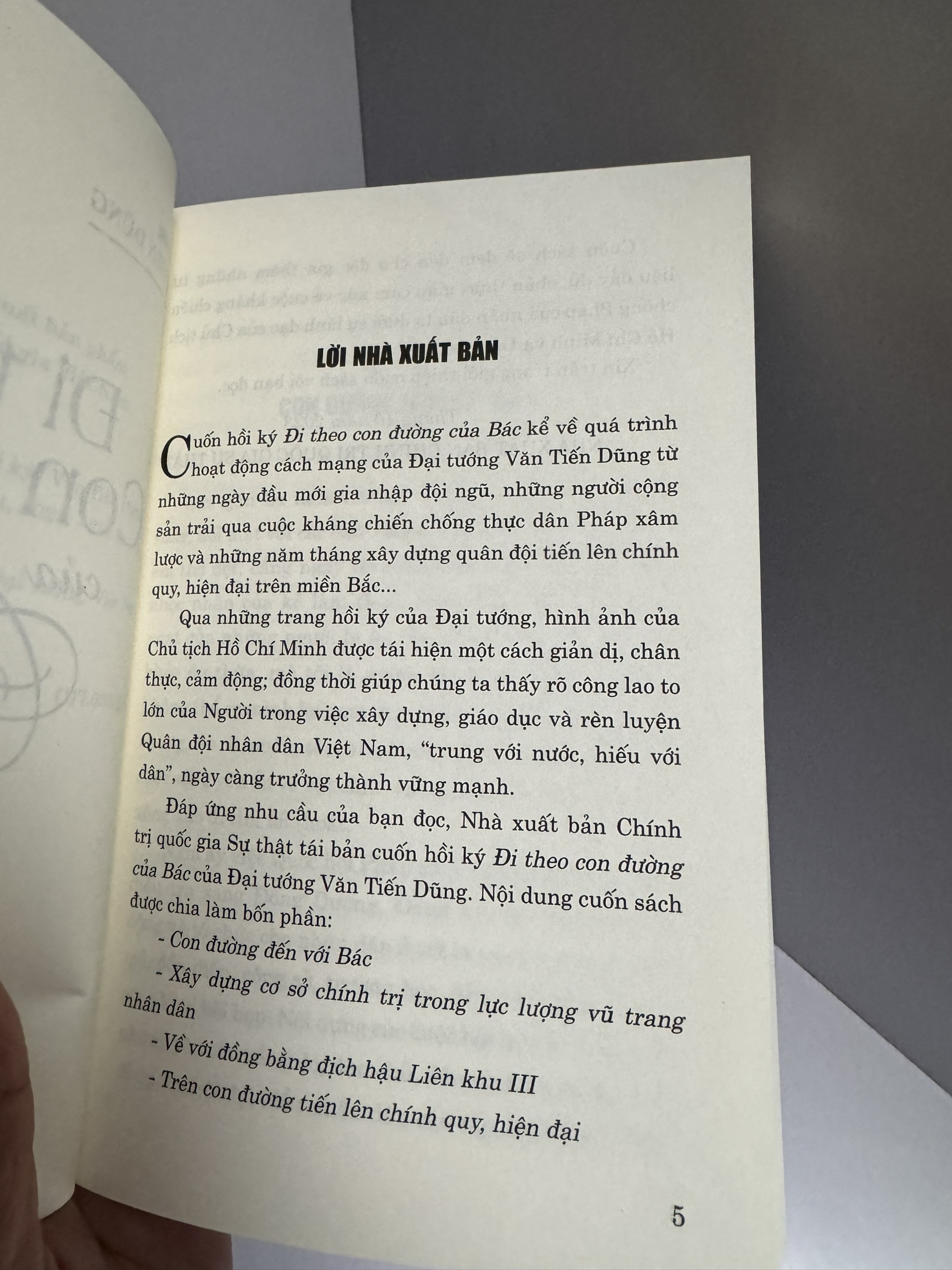 Cuốn hồi ký “Đi theo con đường của Bác” kể về quá trình hoạt động cách mạng của Đại tướng Văn Tiến Dũng từ những ngày đầu mới gia nhập đội ngũ, những người cộng sản trải qua cuộc kháng chiến chống thực dân Pháp xâm lược và những năm tháng xây dựng quân đội tiến lên chính quy, hiện đại trên miền Bắ
