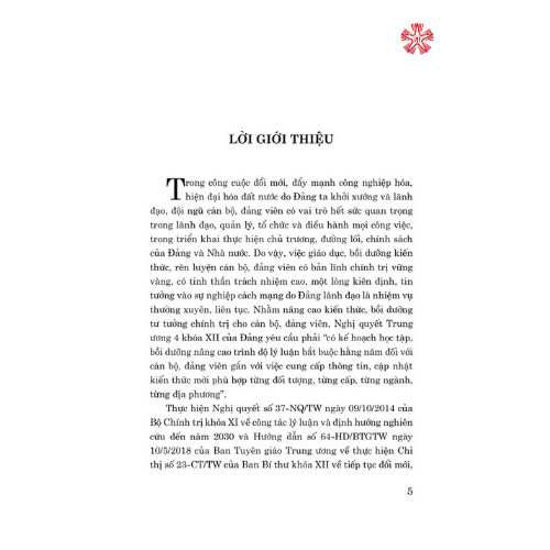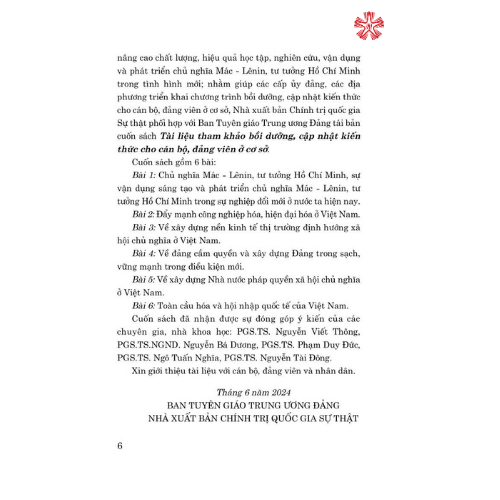 Thực hiện Nghị quyết số 37-NQ/TW ngày 09/10/2014 của Bộ Chính trị khóa XI về công tác lý luận và định hướng nghiên cứu đến năm 2030 và Hướng dẫn số 64-HD/BTGTW ngày 10/5/2018 của Ban Tuyên giáo Trung ương về thực hiện Chỉ thị số 23-CT/TW của Ban Bí thư khóa XII về tiếp tục đổi mới, nâng cao chất lượng, hiệu quả học tập, nghiên cứu, vận dụng và phát triển chủ nghĩa Mác - Lênin, tư tưởng Hồ Chí Minh trong tình hình mới; nhằm giúp các cấp ủy đảng, các địa phương triển khai chương trình bồi dưỡng, cập nhật kiến thức cho cán bộ, đảng viên ở cơ sở, Nhà xuất bản Chính trị quốc gia Sự thật phối hợp với Ban Tuyên giáo Trung ương Đảng tái bản cuốn sách "Tài liệu tham khảo bồi dưỡng, cập nhật kiến thức cho cán bộ, đảng viên ở cơ sở".