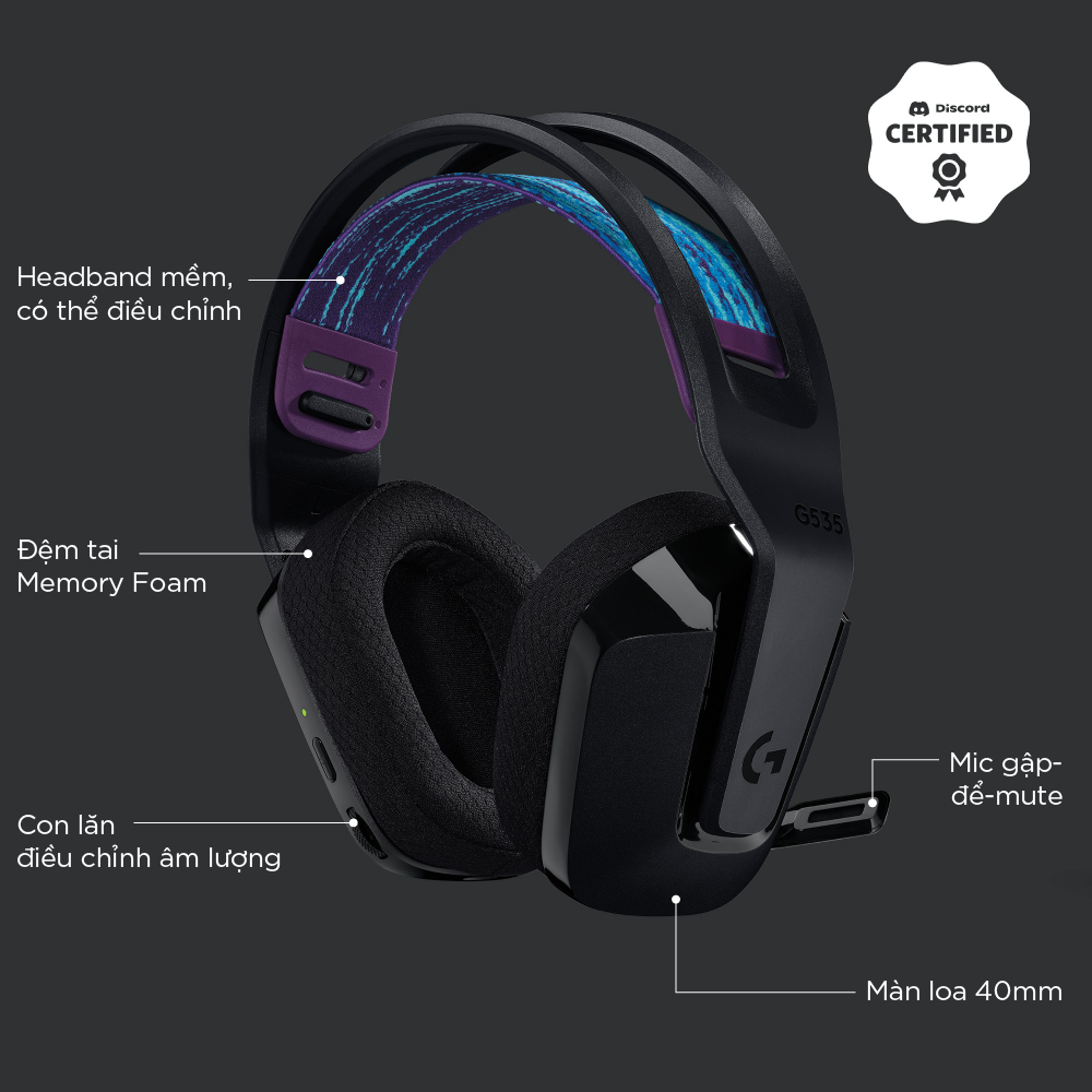 Tai nghe chơi game không dây G535 đem đến cho bạn hiệu suất, sự tự do và thoải mái trong tất cả những buổi chơi game. Công nghệ LIGHTSPEED không dây tiên tiến có độ trễ thấp đem lại sự tự do không dây đáng tin cậy lên tới 12 m và thời lượng pin đáng kinh ngạc 33 giờ.(1) Màng loa 40 mm đem lại âm thanh nổi rõ ràng, trong trẻo và sâu lắng. Chỉ nặng 236 gram, quai đeo có thể điều chỉnh và chụp tai bằng cao su non mềm mại đảm bảo sự thoải mái suốt ngày. Các nút điều khiển trên tai nghe cho phép bạn nhanh chóng tăng âm lượng trò chơi hoặc âm nhạc. Chỉ cần gấp lên để tắt tiếng và giấu gọn gàng. G535 đã được chứng nhận Discord để đảm bảo đem lại hiệu suất giao tiếp rõ như pha lê với âm thanh và độ rõ ràng giọng nói tuyệt vời.