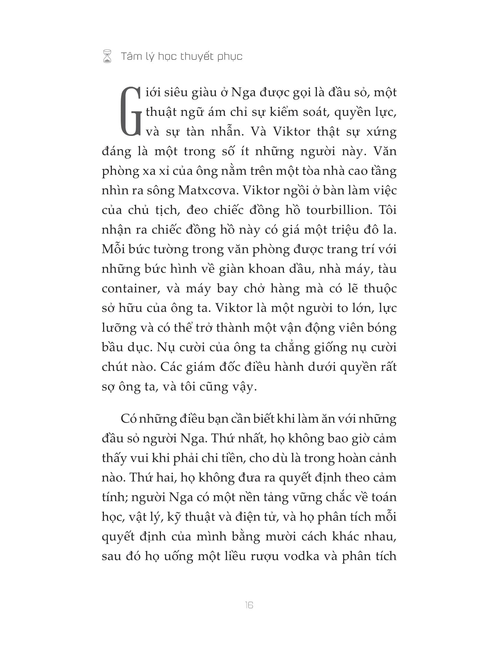 “Ngày nay, sản phẩm không phải để bán, mà là để mua.” Hoạt động bán hàng biến đổi hằng ngày và cách thức người mua thực hiện giao dịch cũng đang thay đổi cách thức người bán thực hiện chào hàng. Thay vì thúc ép dẫn đến kháng cự, cách hiệu quả hơn để chinh phục người mua là khiến họ bị thuyết phục và tự nguyện chi tiền. “Tâm lý học thuyết phục” cung cấp cho bạn phương pháp bán hàng hoàn toàn mới, không chèo kéo, không gây áp lực, giúp bạn có thể bán bất kỳ thứ gì cho bất kỳ ai.