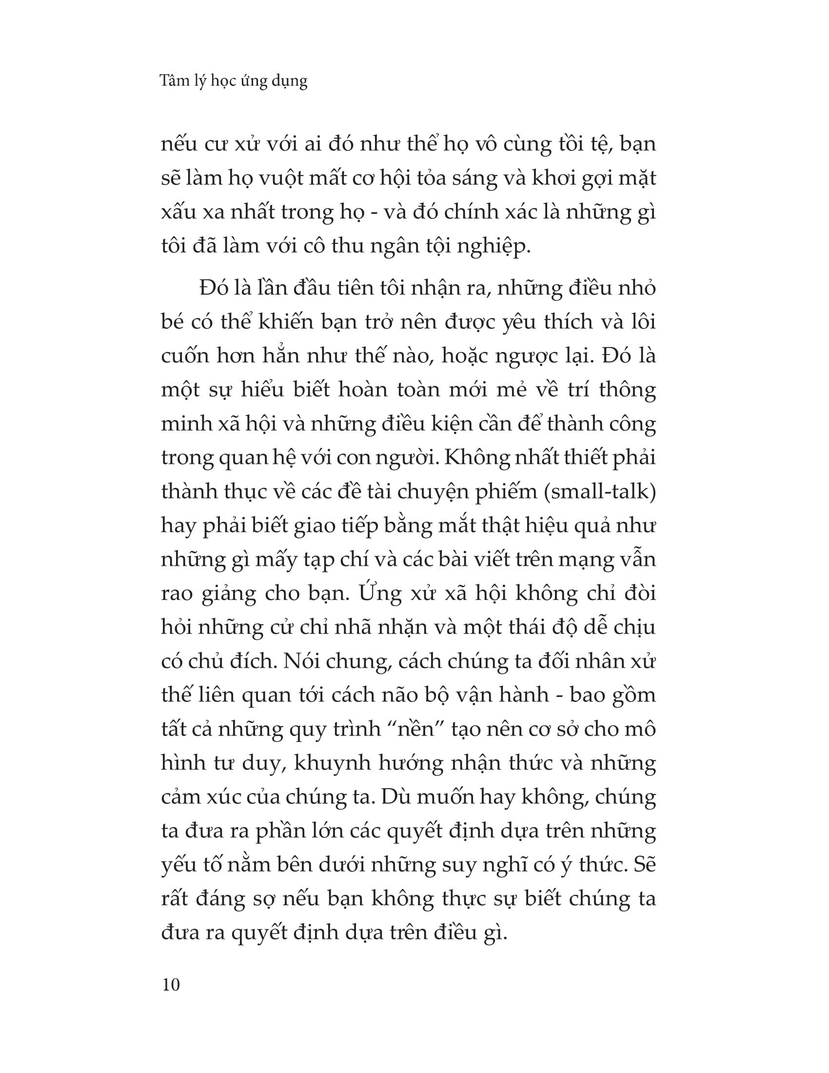 Bên cạnh bốn đặc điểm tính cách, rất nhiều nguyên tắc nhận thức khác cũng có tác động lớn đến việc bạn có được mọi người yêu mến hay không. Trong cuốn sách này, chúng ta sẽ tìm hiểu về một số điều như nguyên tắc “có qua có lại”, hiệu ứng Pygmalion, định kiến “cùng nhóm” và “khác nhóm”… Ngoài các nguyên tắc khá gián tiếp để gia tăng thiện cảm, sách cũng cung cấp những mẹo giúp ta trực tiếp trở nên dễ mến hơn trong mắt người đối diện. Nói ít đi, lắng nghe nhiều hơn, tỏa ra tinh thần tích cực và học cách đồng cảm, trở thành đồng minh của mọi người… đây có vẻ đều là những bí kíp có vẻ quen thuộc, nhưng khi chúng được phân tích kỹ càng dưới lăng kính tâm lý học và được củng cố bởi các nghiên cứu uy tín, chúng ta sẽ chủ động ứng dụng hiệu quả hơn những phương pháp này vào các tình huống xã hội thực tế.