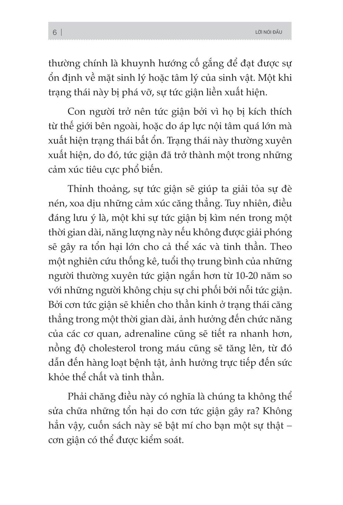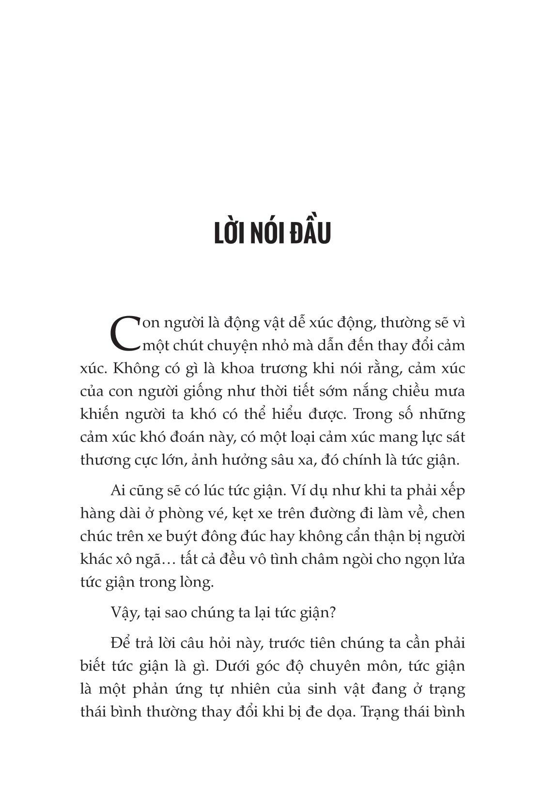 Muốn kiểm soát được cơn giận của bản thân, chúng ta cần phải có nghị lực và tự nhận thức về hậu quả của nó mang lại. Một khi bạn hiểu được nguyên nhân gây ra sự tức giận của m.ình, bạn sẽ có thể kiểm soát tốt nhất và biến nó thành động lực tích cực để có một cuộc sống tốt đẹp hơn. Hy vọng cuốn sách này sẽ giúp bạn có thể kìm nén được sự tức giận của m.ình một cách hiệu quả, cải thiện mối quan hệ với những người xung quanh và thực sự sống một cuộc sống hạnh phúc và bình yên,
