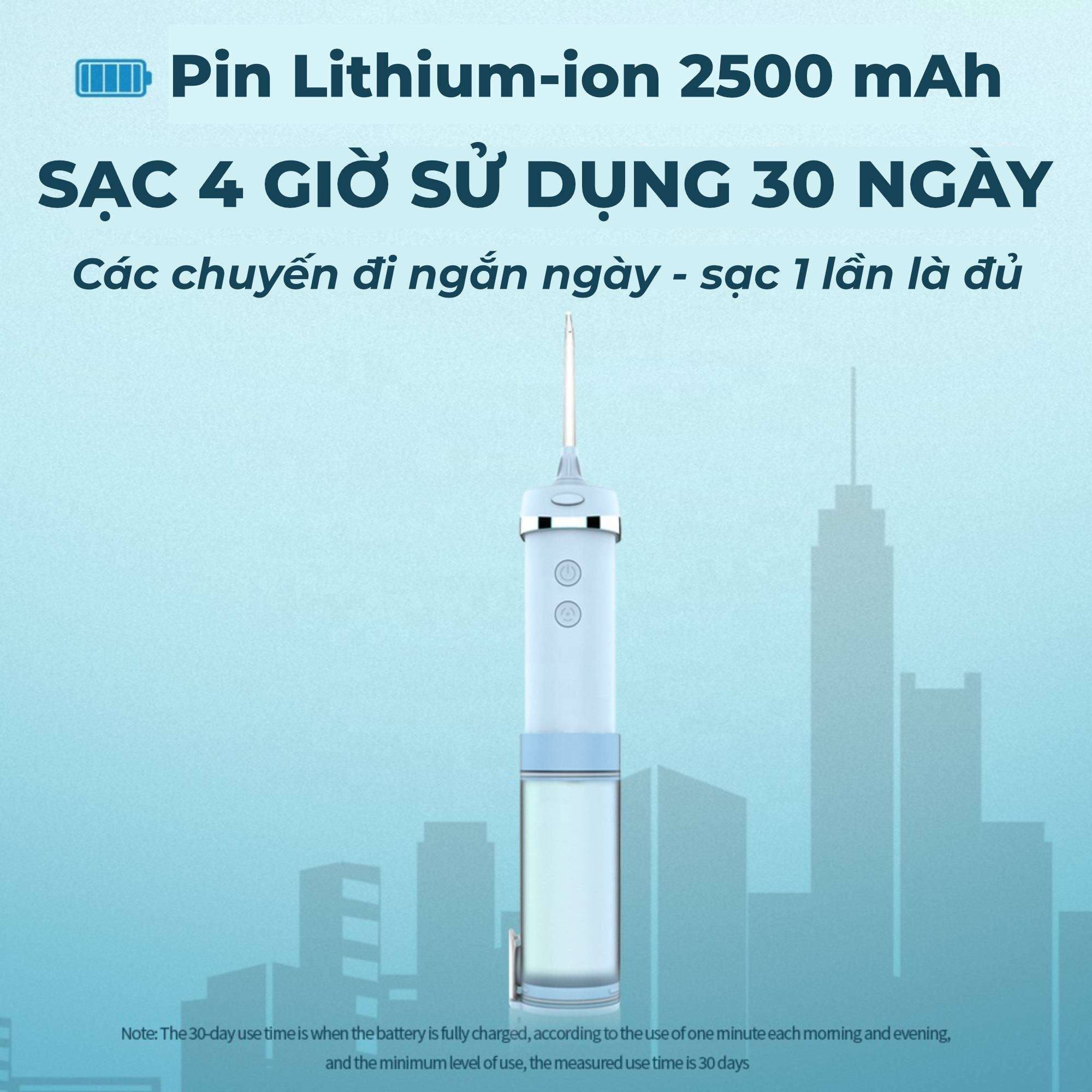 - Máy tăm nước sử dụng pin sạc thường có kích thước nhỏ gọn để có thể mang theo người dễ dàng khi ra ngoài. Nhưng bù lại thường có kích thước pin nhỏ, động