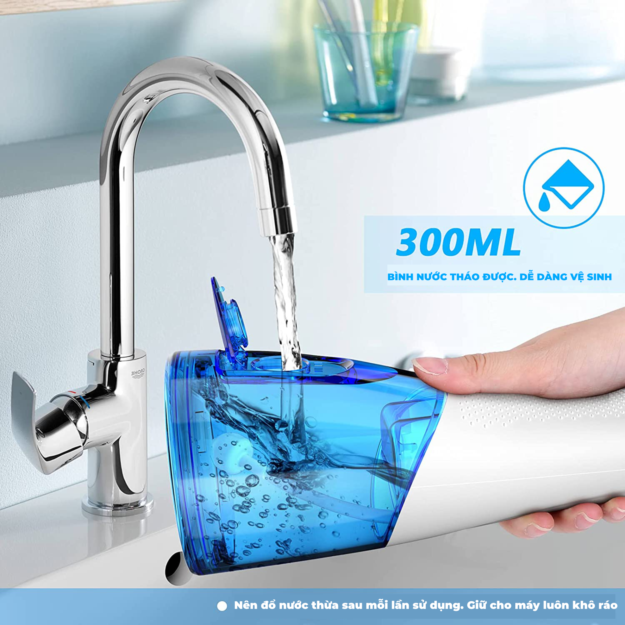 Máy tăm nước dùng trong gia đình Dung tích bình chứa nước 600ml Điện áp 100-240V Tần số 50/60Hz Công suất 18W Gồm 6 đầu tăm 10 mức áp lực nước
