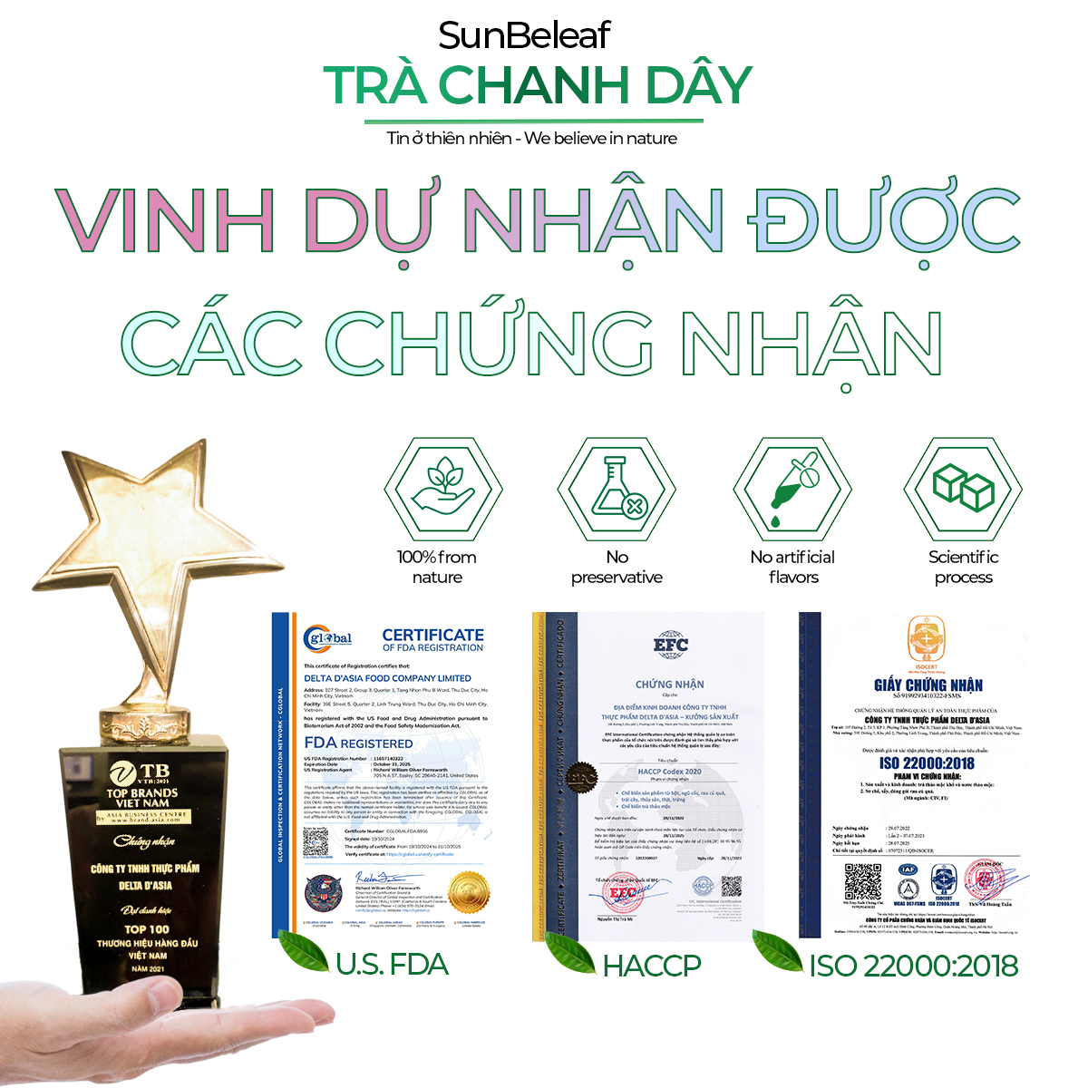 Mua tại TiktokTrà Chanh Dây hòa tan Sunbeleaf, có chanh dây thật, trà hoa quả tươi ngon, thanh mát, được tặng thêm 2 gói giá không đổi, hộp trà hòa tan 10 gói [DEAL SIÊU ĐỈNH, QUÀ SIÊU HOT] --> Quý khách hàng khi mua sản phẩm với giá trị đơn hàng tối thiểu nhất định sẽ nhận được phần quà độc quyền từ SunBeleaf bao gồm Gói trà cao cấp hoặc Chai thủy tinh 500ml. SunBeleaf tự hào đồng hành cùng Quý Khách trên hành trình chăm sóc sức khỏe và tận hưởng những giá trị tuyệt vời từ thiên nhiên. Với cam kết không ngừng nâng cao chất lượng sản phẩm, chúng tôi ứng dụng dây chuyền sản xuất hiện đại đạt chuẩn quốc tế như FDA Hoa Kỳ, HACCP, và ISO 22.000:2018. Sunbeleaf là lựa chọn hoàn hảo để tận hưởng hương vị tự nhiên, giúp giải khát, thư giãn, bổ sung năng lượng, hỗ trợ tiêu hóa và mang đến cảm giác sảng khoái mỗi ngày. ❖ Thương hiệu: Trà Sunbeleaf ❖ Số lượng: Hộp trà 10 gói. ❖ Loại trà: Trà hòa tan. ❖ Thành phần: Đường kính, hồng trà, hương chanh dây tự nhiên, Chanh Dây thật (35%). ❖ Hạn sử dụng: 24 tháng. ❖ Xuất xứ: Việt Nam. 5 Tác Dụng Tuyệt Vời của Trà Chanh Dây SunBeleaf: ❖ Giải khát và sảng khoái: Chanh dây tự nhiên mang lại hương vị chua ngọt, tươi mát, giúp xua tan mệt mỏi và mang đến cảm giác sảng khoái tức thì. ❖ Hỗ trợ tiêu hóa: Tinh chất hồng trà kết hợp cùng chanh dây giàu chất xơ tự nhiên giúp kích thích hệ tiêu hóa hoạt động hiệu quả và nhẹ nhàng hơn. ❖ Bổ sung năng lượng: Đường và Malto dextrin cung cấp nguồn năng lượng nhanh chóng, giúp bạn luôn tỉnh táo và tràn đầy sức sống. ❖ Tăng cường sức đề kháng: Chanh dây giàu vitamin C và các chất chống oxy hóa tự nhiên, giúp hỗ trợ hệ miễn dịch khỏe mạnh và bảo vệ cơ thể trước các tác nhân gây hại. ❖ Thưởng thức hương vị độc đáo: Công thức cân bằng hoàn hảo giữa vị chua thanh của chanh dây và vị ngọt nhẹ tự nhiên, phù hợp cho mọi lứa tuổi và mang lại trải nghiệm thưởng trà thú vị. Cam kết sản phẩm chính hãng, chúng tôi sở hữu các chứng chỉ: 'Tin ở thiên nhiên', chúng tôi luôn mang đến sản phẩm có nguồn gốc 100% từ thiên nhiên, đảm bảo chất lượng tốt nhất cho quý khách. Nếu sản phẩm gặp bất kỳ vấn đề nào, đừng vội đánh giá xấu mà hãy liên hệ với shop ngay để được hỗ trợ đổi trả hoặc giải quyết nhanh chóng. Chúng tôi luôn sẵn lòng giúp đỡ và mang lại trải nghiệm mua sắm hài lòng nhất cho bạn! Shop chân thành cảm ơn Quý Khách