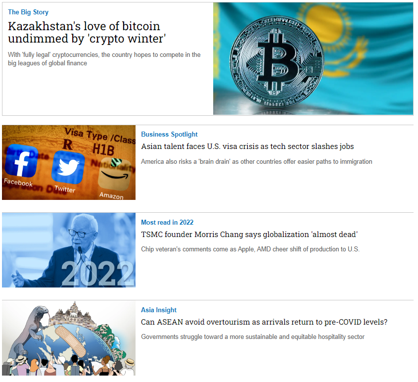 Nikkei Asia là tạp chí bằng tiếng Anh rất uy tín của Nikkei - Nhật Bản, chuyên viết về Xu hướng khu vực châu Á - Thái Bình Dương, Kinh tế, Công nghệ, Chính trị,