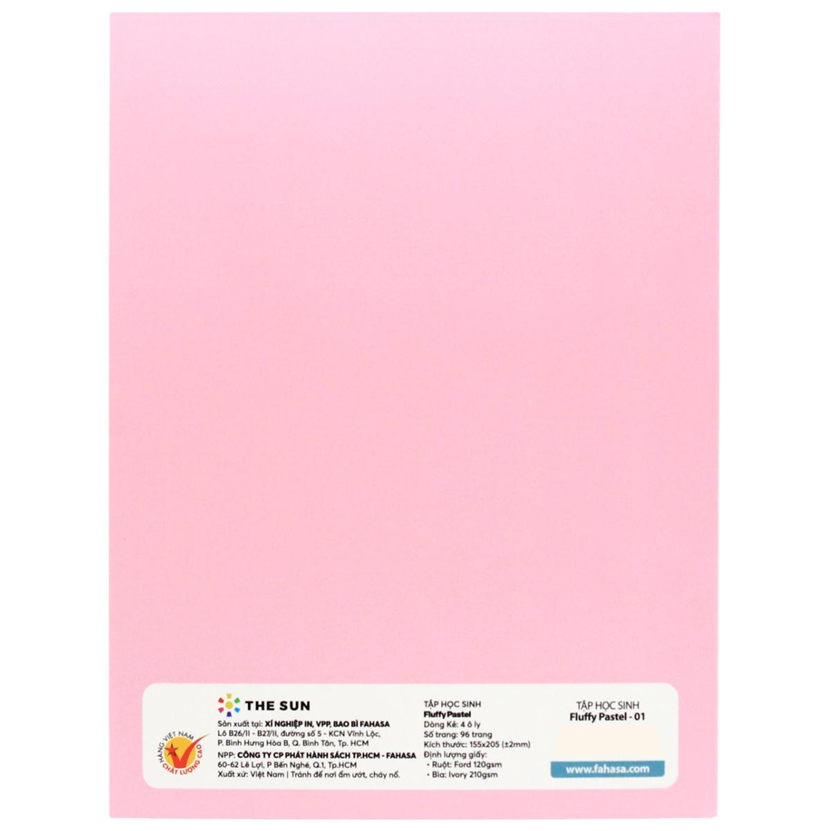 Tập Học Sinh Fluffy Pastel - 4 Ôly - 96 Trang 120gsm - The Sun với mặt giấy láng mịn, viết êm tay, tạo nét chữ đẹp. Giấy viết không bị lem, độ trắng không làm hại mắt, ăn mực hầu hết các loại bút, giấy viết không nhòe, không thấm mực ra trang sau.