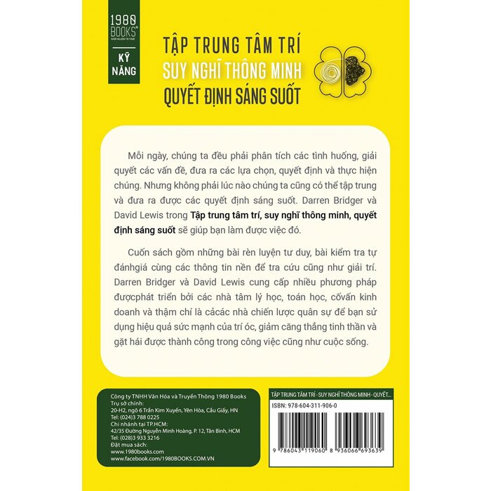 Mỗi ngày chúng ta đều phải phân tích các tình huống, giải quyết các vấn đề, đưa ra các lựa chọn, quyết định và thực hiện chúng. “Tập trung tâm trí, suy nghĩ thông minh, quyết định sáng suốt” sẽ chỉ cho bạn cách để làm các việc trên hiệu quả hơn. Cuốn sách sẽ hướng dẫn bạn cách sử dụng những phương pháp đã được phát triển bởi các nhà tâm lý học, toán học, cố vấn kinh doanh, vận động viên và thậm chí là cả các nhà chiến lược quân sự. Cuốn sách bao gồm những bài luyện tư duy, các bài kiểm tra tự đánh giá cùng với các thông tin nền để tra cứu cũng như giải trí. Tất cả đều là những công cụ giúp bạn sử dụng sức mạnh trí óc hiệu quả hơn.