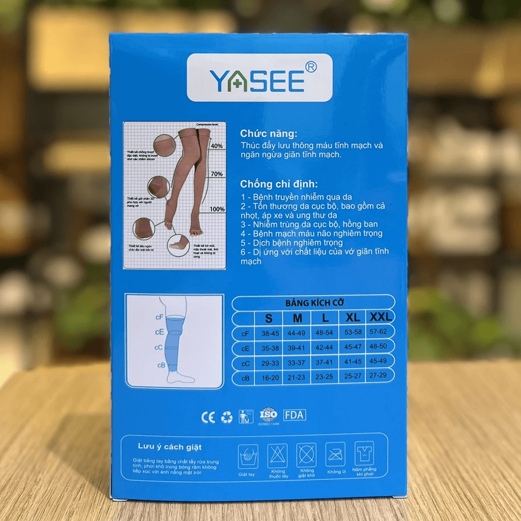 Mua tại TiktokVớ đùi không bàn chân Yasee – Giải pháp nhẹ chân toàn diện cho người bị giãn tĩnh mạch Vớ đùi không bàn chân Yasee là loại tất đùi y khoa (compression thigh-high, footless) được thiết kế để hỗ trợ người bị suy giãn tĩnh mạch và ngăn ngừa biến chứng ở vùng đùi và cẳng chân. Loại vớ này không che phần bàn chân, giúp mang thoải mái hơn với giày dép, dễ vệ sinh và duy trì độ thoáng khí cho ngón chân. Sản phẩm thường được bán theo 1 đôi/hộp. Yasee cung cấp nhiều kích cỡ (S, M, L, XL, XXL) để phù hợp với từng người dùng. Vớ được phân loại theo áp lực y khoa (Class 1, Class 2) để đáp ứng nhu cầu nhẹ hoặc mức hỗ trợ cao hơn. Ưu Điểm Nổi Bật Của Vớ Yasee Áp lực nén đạt chuẩn y khoa Vớ Yasee được chia làm hai mức áp lực nén (compression class) khác nhau để đáp ứng nhu cầu sử dụng: