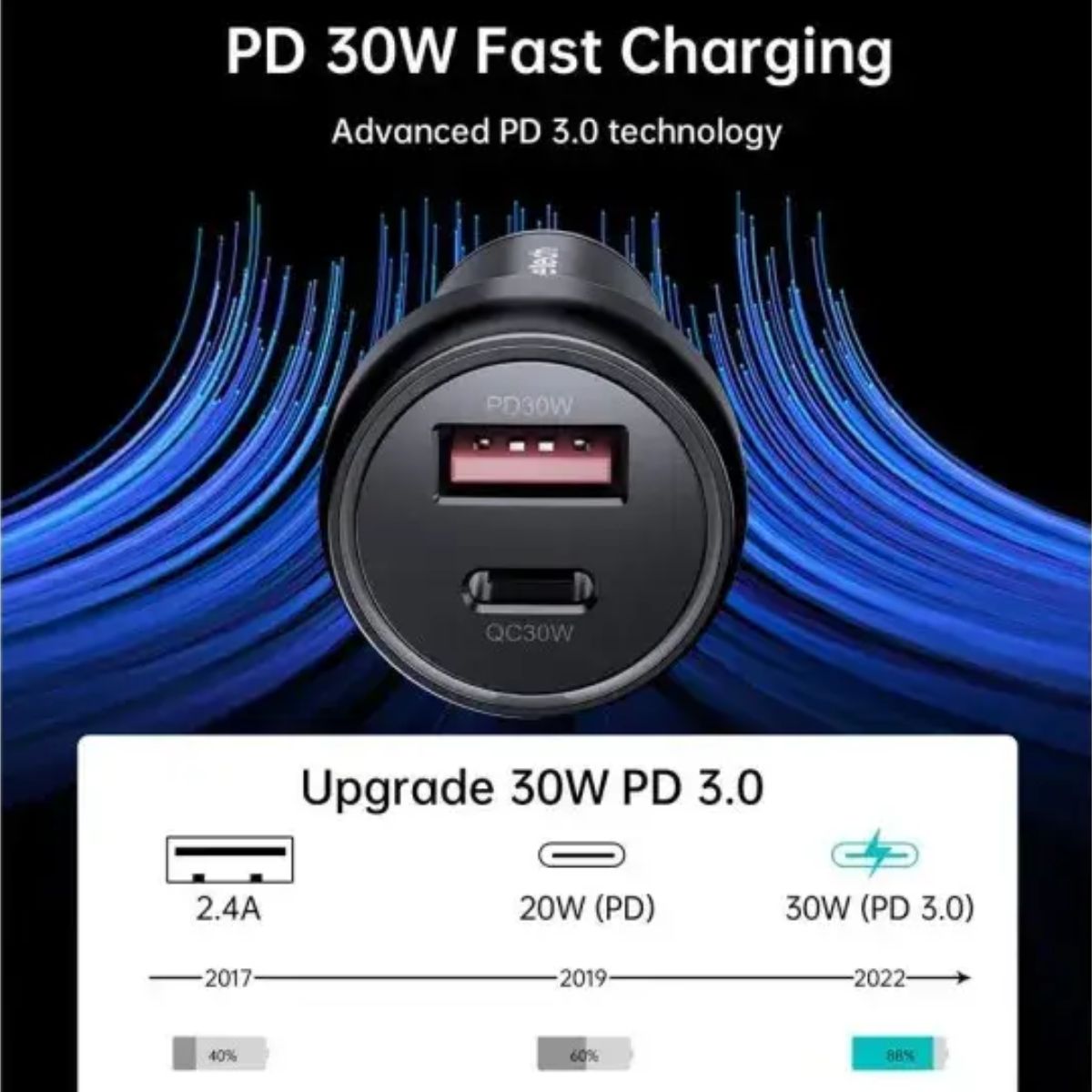 - USB A: 5.0V~3.0A, 9.0V~3.0A, 12.0V~2.5A (30.0w Max)