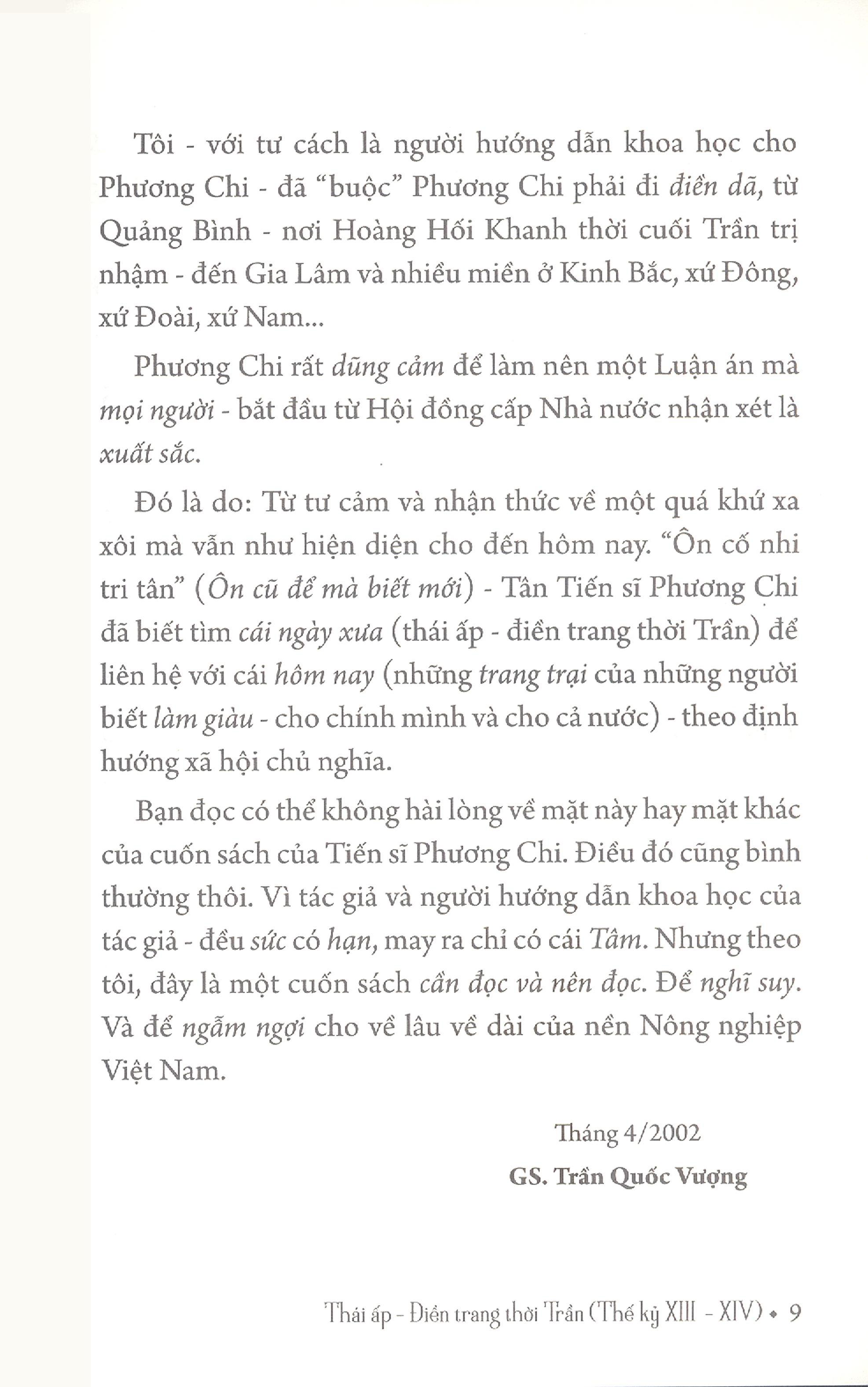 Sự tồn tại của các thái ấp – điền trang là một trong những đặc điểm nổi bật góp phần tạo nên cơ sở kinh tế - xã hội thời Trần, một thời kỳ hiển hách trong lịch sử dân tộc với võ công ba lần kháng chiến thắng lợi chống quân xâm lược Mông – Nguyên. Trong công trình “Thái ấp – điền trang thời Trần (thế kỷ XIII-XIV)”, qua việc điểm lại rõ nét về tình hình xã hội Đại Việt thời Trần trên các mặt kinh tế, chính trị, tổ chức chính quyền, quân độ tác giả Nguyễn Thị Phương Chi đã đưa ra được một số nội dung mới mẻ trong nghiên cứu về lịch sử thời kỳ Cổ - Trung đại khi gắn các vấn đề nông nghiệp, ruộng đất và sự tồn tại của thái ấp – điền trang thời Trần với điều kiện tự nhiên và môi trường như đất đai, sông biể Tác giả đã đưa ra nhiều nhận xét, đánh giá khá táo bạo về vai trò của các thái ấp – điền trang thời Trần, nêu ý nghĩa tích cực của các loại hình này trong việc kết hợp nhiệm vụ xây dựng và bảo vệ đất nước thời Trần, nhất là khi cả dân tộc dồn sức chống xâm lược. Đồng thời, tác giả cũng nêu những hạn chế của chế độ thái ấp và điền trang đã gây nên tình trạng phân tán là điều mâu thuẫn với xu hướng tập quyền thời bấy giờ.