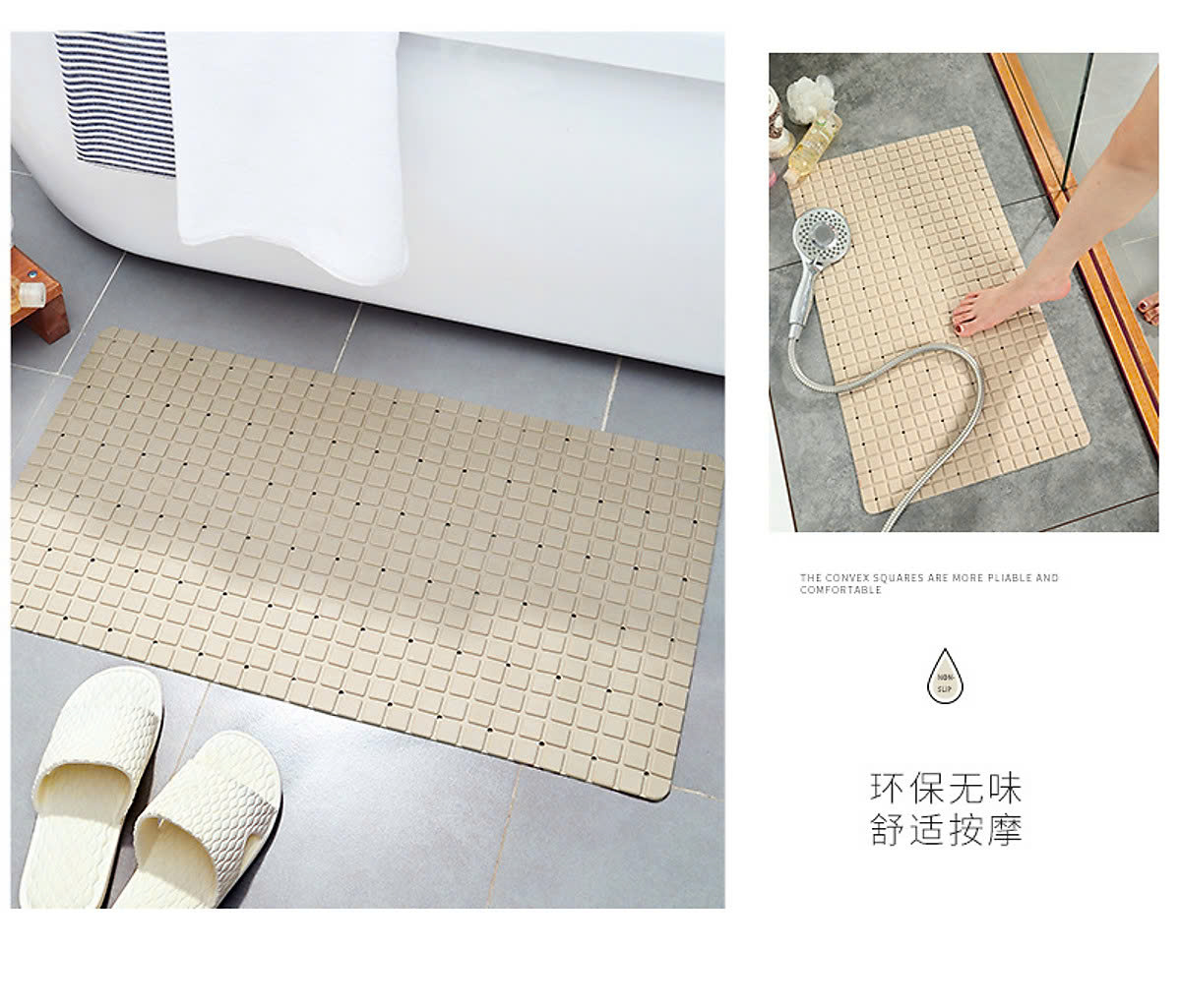 - Vị tri đặt tấm thảm : Đặt tại phòng tắm trong bể bơi, nhà vệ sinh trong trường mầm non, căn hộ. Thảm trải chống trơn nhà tắm với chất liệu bằng nhựa do đó không thấm nước, mặt khách tấm thảm được thiết kế đơn gian mà tinh tế với chữ nhật phối điểm vuông rất sang trọng. Với chất nhựa cao su PVC chống thấm nước, giữa các rảnh có những lỗ tròn giúp thoát nước, thông thoáng giữa 2 mặt thảm làm cho tấm thảm không bị giữ nước trên bề mặt do đó giúp cho bề mặt thảm luôn khô giáo và sạch sẽ hơn. Thảm Lót Chân Nhà Tắm Chống Trơn Trượt có 3 màu xám, trắng, vàng kem giúp cho quý khách hàng có nhiều sự chọn lựa, và có thế dễ dàng thay thế hoặc đan xen giữa các màu làm cho phòng tắm, nhà vệ sinh, hay bể bơi của gia đình mình được sinh động hơn nhiều. Mặt khác nhờ thiết kế kích thước với nhiều loại khổ rộng khách nhà, dễ dàng cắt ghép vì vậy các bạn có thể hoàn toàn yên tâm khi kích thước của nhà tắm gia đình mình nhỏ hay lớn.