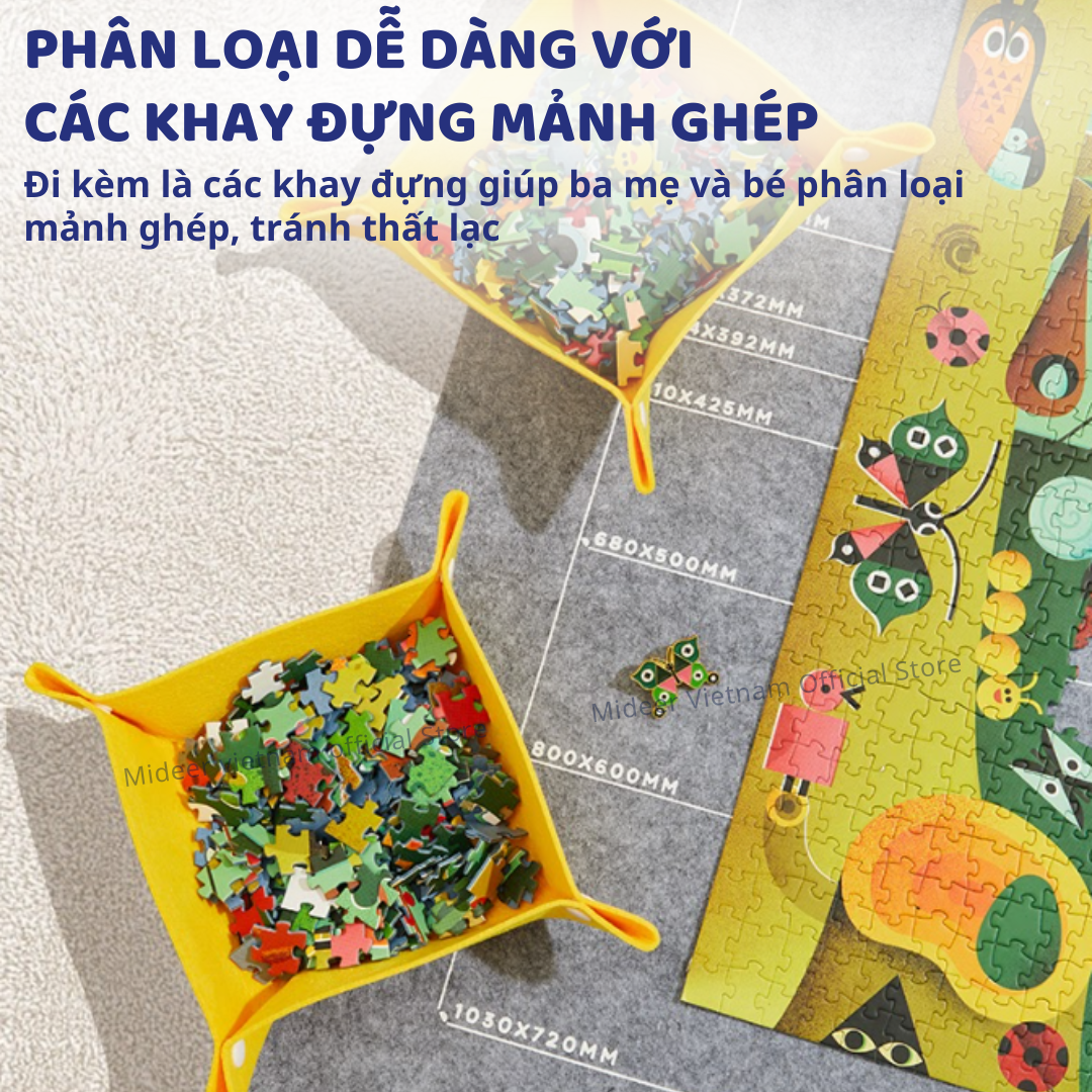 - KÍCH THƯỚC LỚN, THOẢI MÁI CHO CÁC BỘ GHÉP HÌNH LỚN Với thiết kế "siêu khủng", thảm ghép hình Mideer đủ rộng để chứa các bộ ghép hình từ 35-2000 miếng, phù hợp với mọi nhu cầu ghép hình của bé.