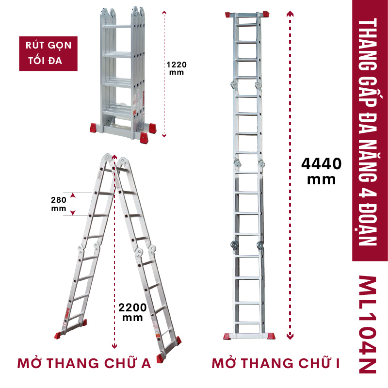 - Kích thước thang : ( Cao tối đa xếp chữ A ) : 2220mm x ( Cao tối đa duỗi thẳng chữ I ) : 4440mm x ( Cao khi xếp hình thang U lộn ngược ) : 1270mm x ( Cao khi gấp gọn ) : 1270mm x ( Rộng ) : 370mm.